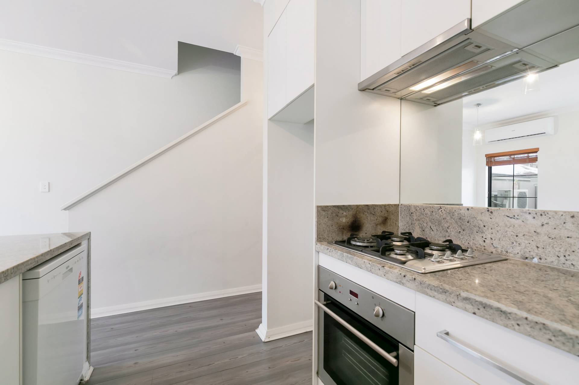 The kitchen features beautiful stone benchtops, stainless steel gas appliances, a dishwasher, high ceilings and plenty of cupboard space. The adjacent dining area opens out to the north facing courtyard, allowing plenty of light to fill this space and a reverse cycle air conditioner.