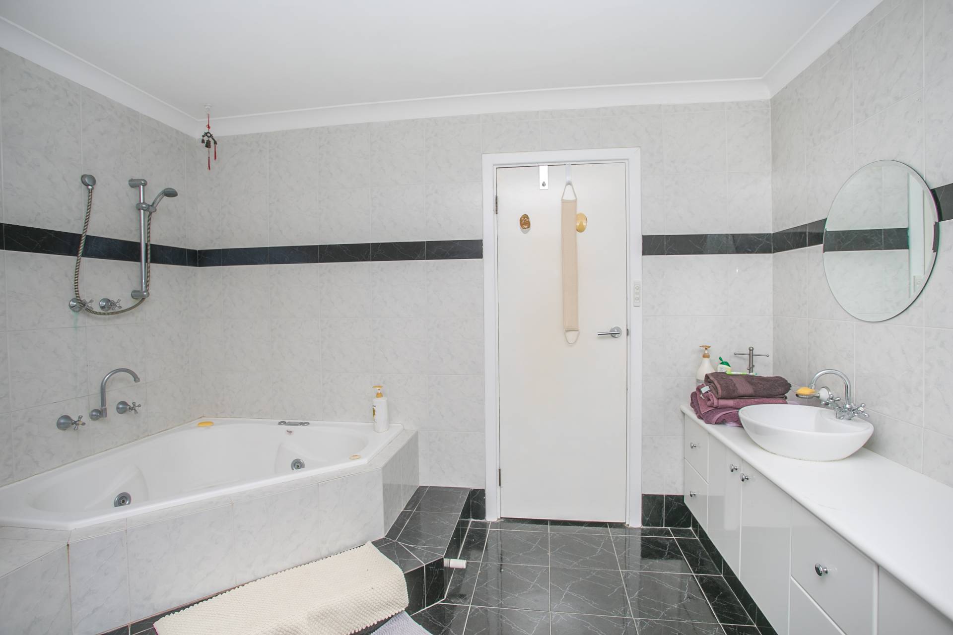 • En-suite bathroom with dual vanities and a corner spa bath