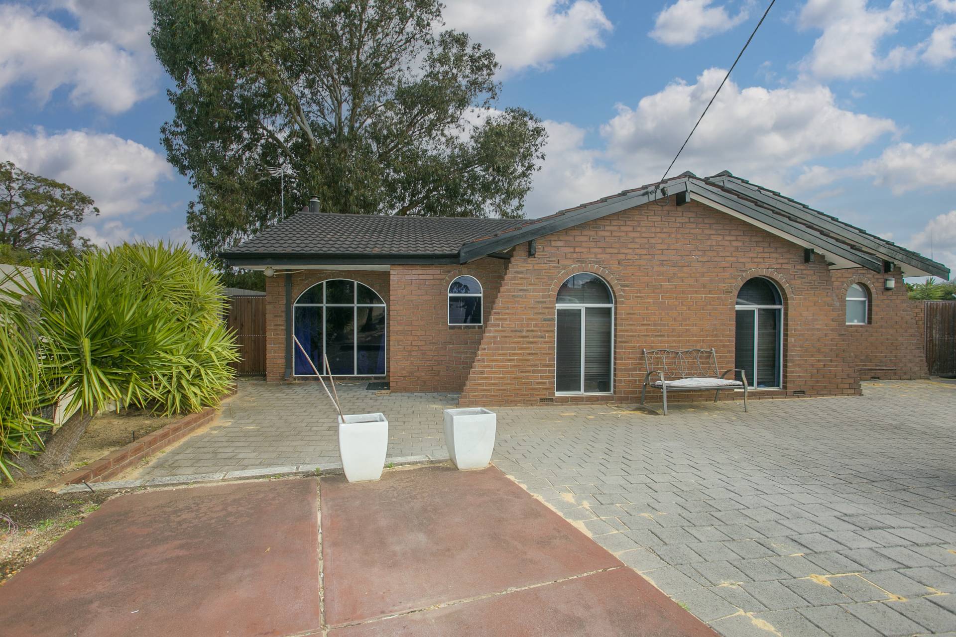 • 1970s brick and tile build with a double pitched roof line and arched doors and windows