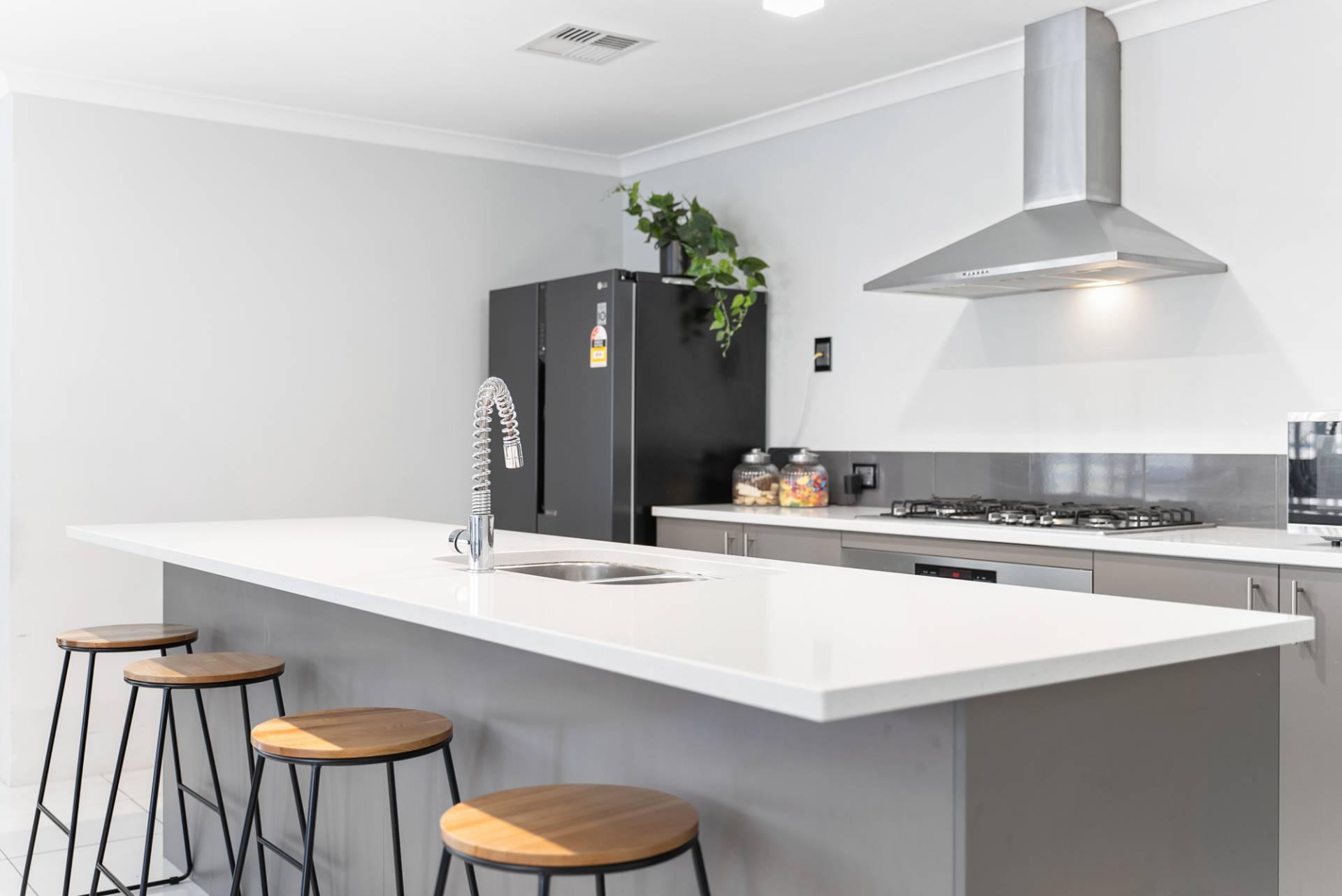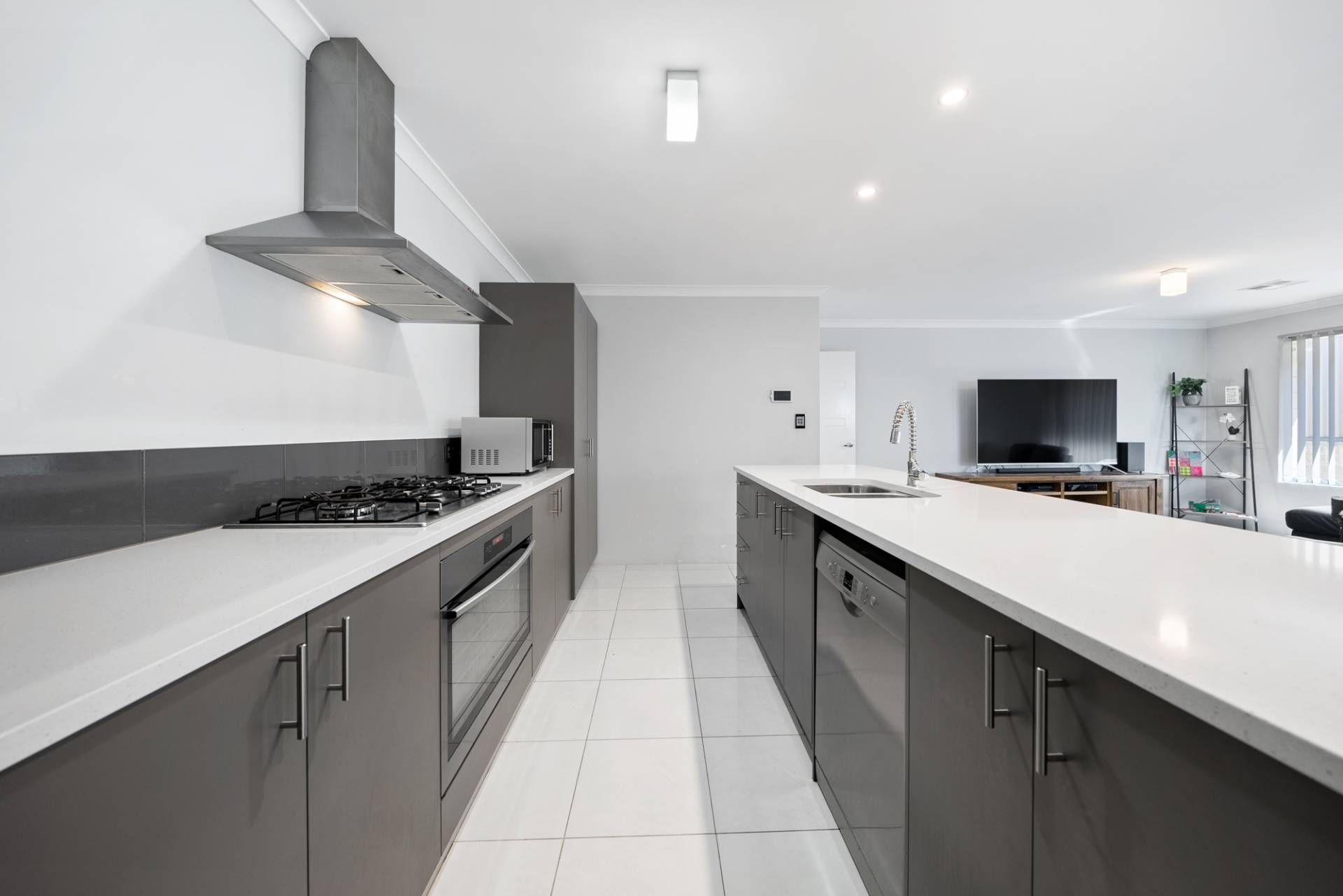 Fantastic kitchen with stone benches and stainless steel appliances, including a dishwasher