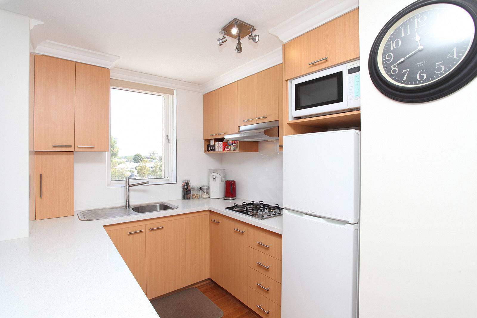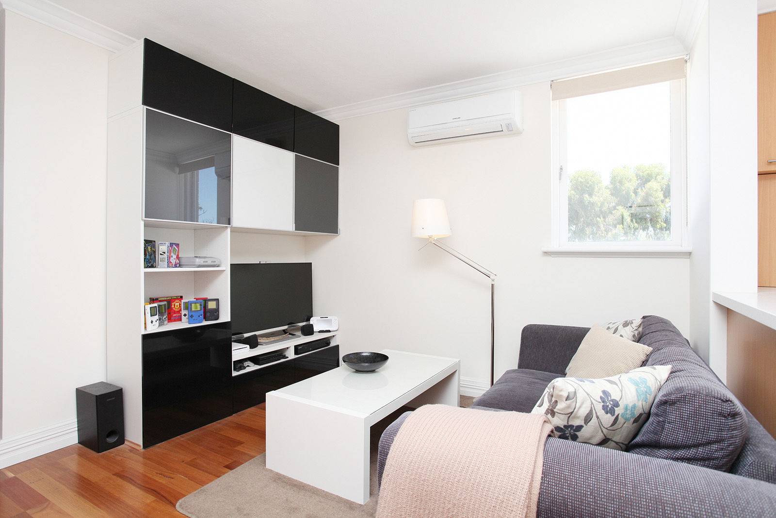 The kitchen has been fitted with Caesarstone bench tops that are highlighted with stainless steel appliances. Ample storage is provided by the installation of the overhead cupboards. A clever choice of wall unit that incorporates more storage space without encroaching onto the living area with more storage space created with cupboards hung to the eastern wall.