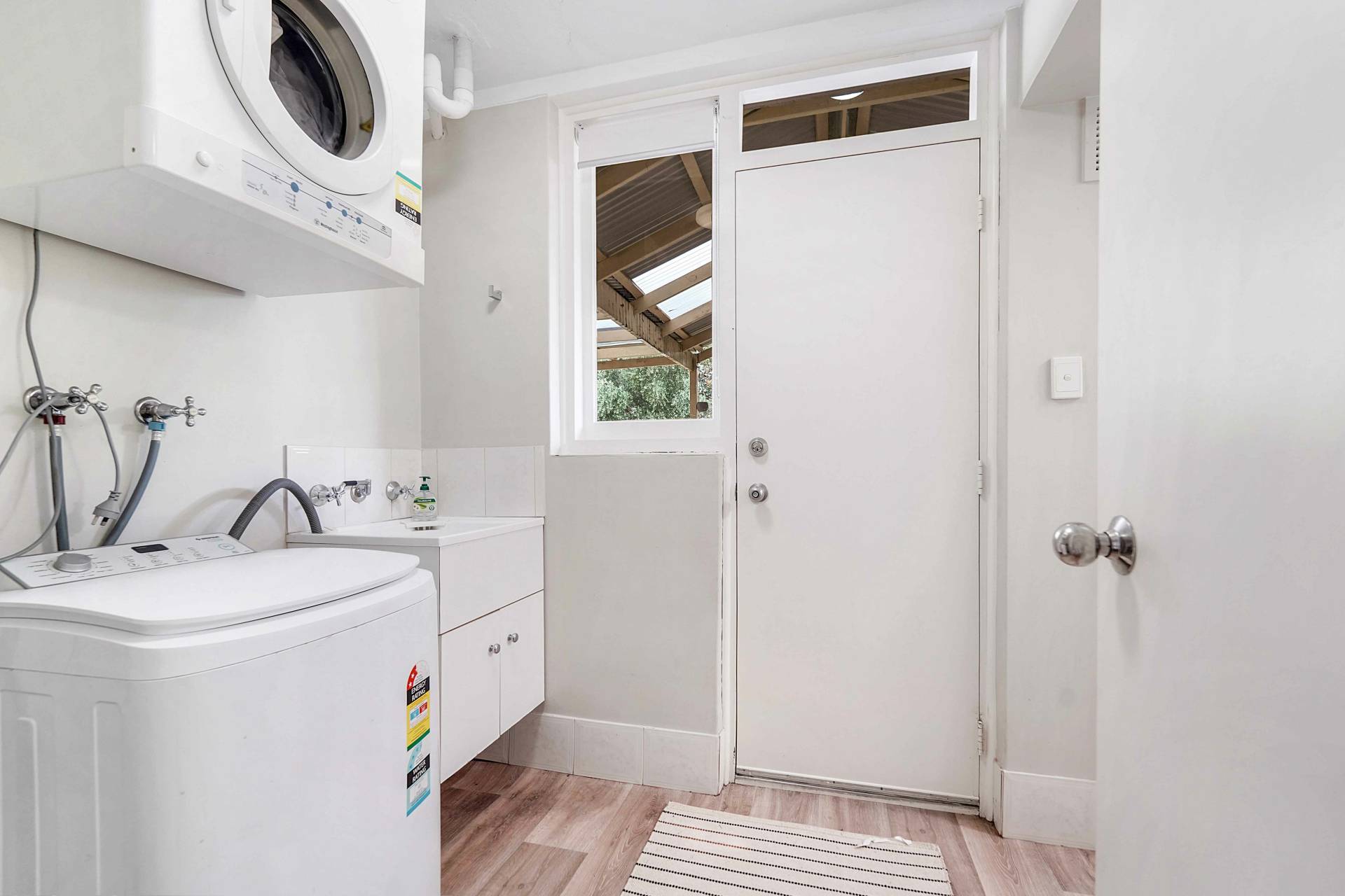 Mirrored medicine cabinets, a floating vanity with integrated basin and an oversized semi-frameless shower feature in the bathroom. The laundry has an external door to the yard, and room for your washer and dryer.