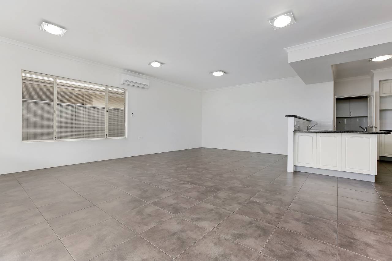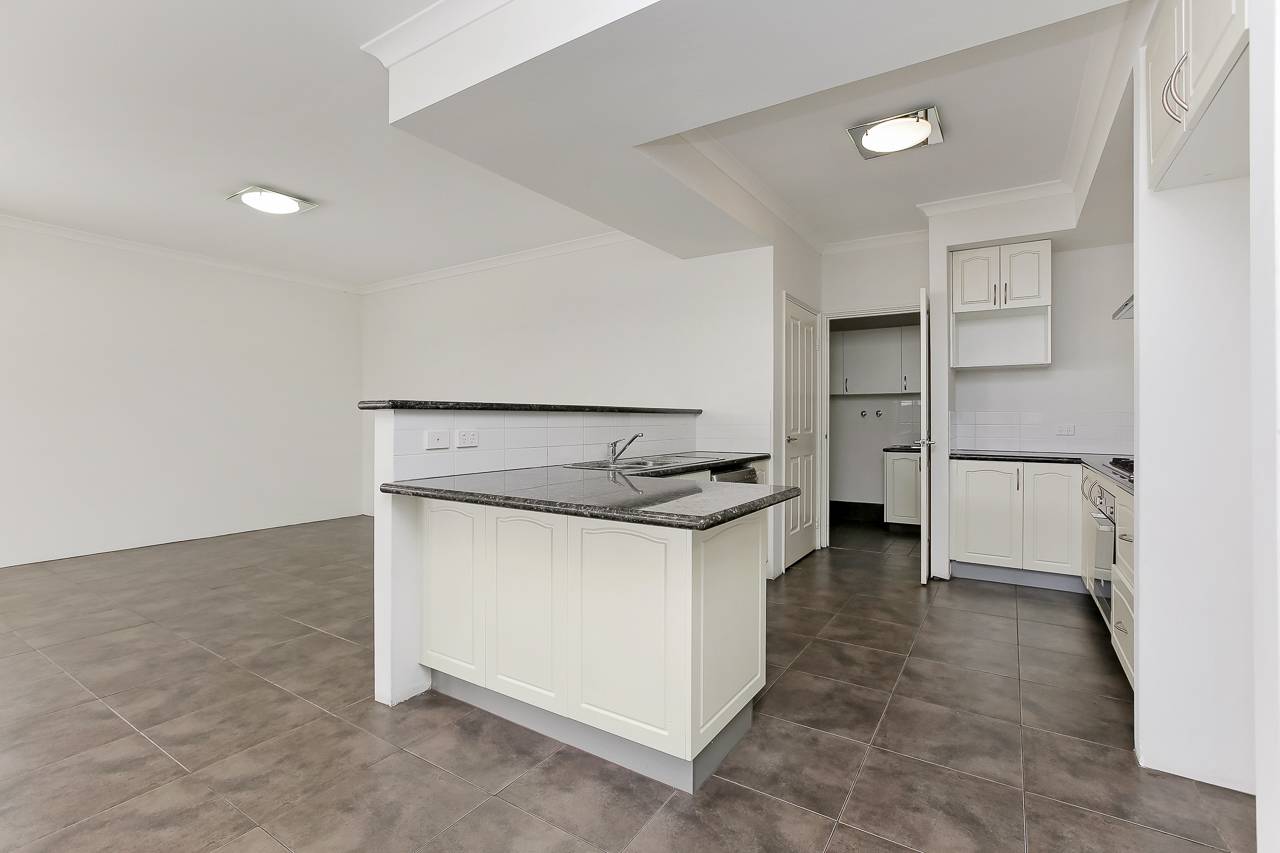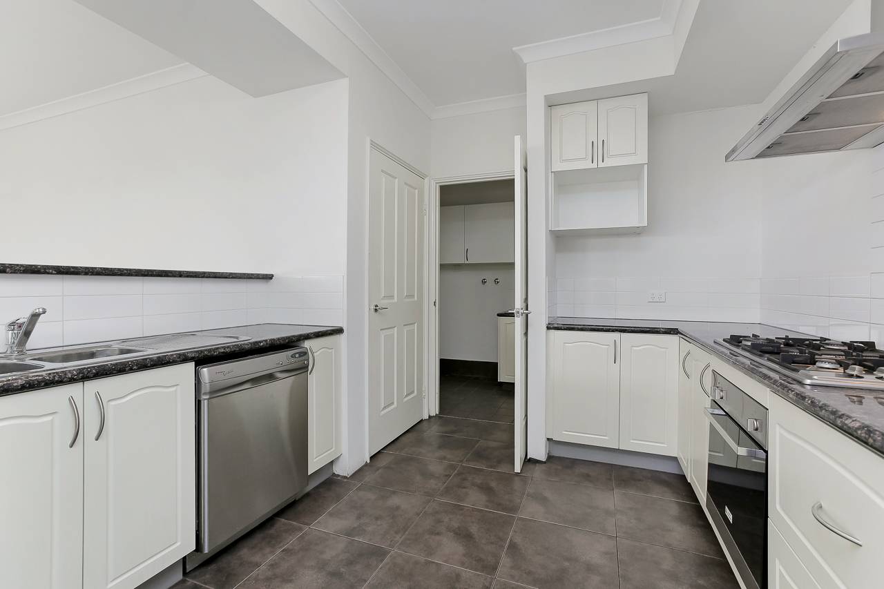 Neutral floor tiles, crisp white walls and slimline Venetians throughout provide a palette you can decorate with ease. The central, open-plan living and dining area enjoys plenty of natural light, and the adjacent kitchen is complete with stainless steel appliances, including a dishwasher, a walk-in pantry and recesses for your fridge and microwave.