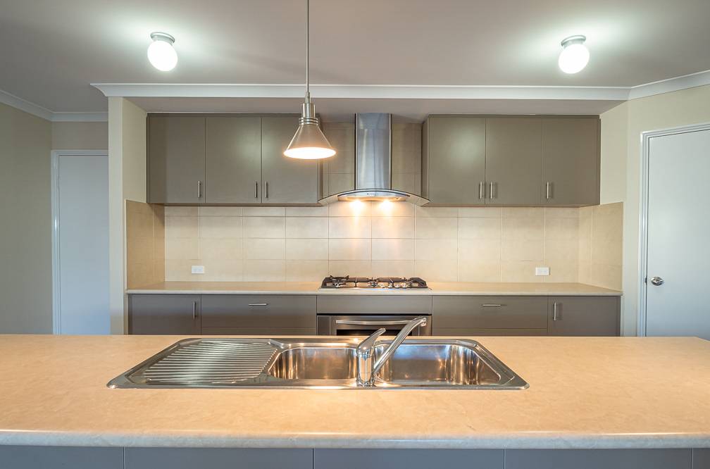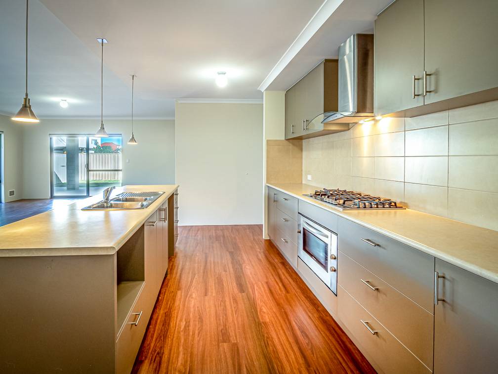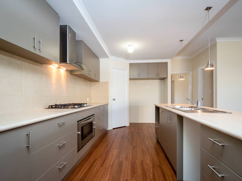 Stainless steel appliances including canopy rangehood, gas cooktop and electric oven can be found in the modern kitchen, and feature pendant lighting hangs above the breakfast bar.