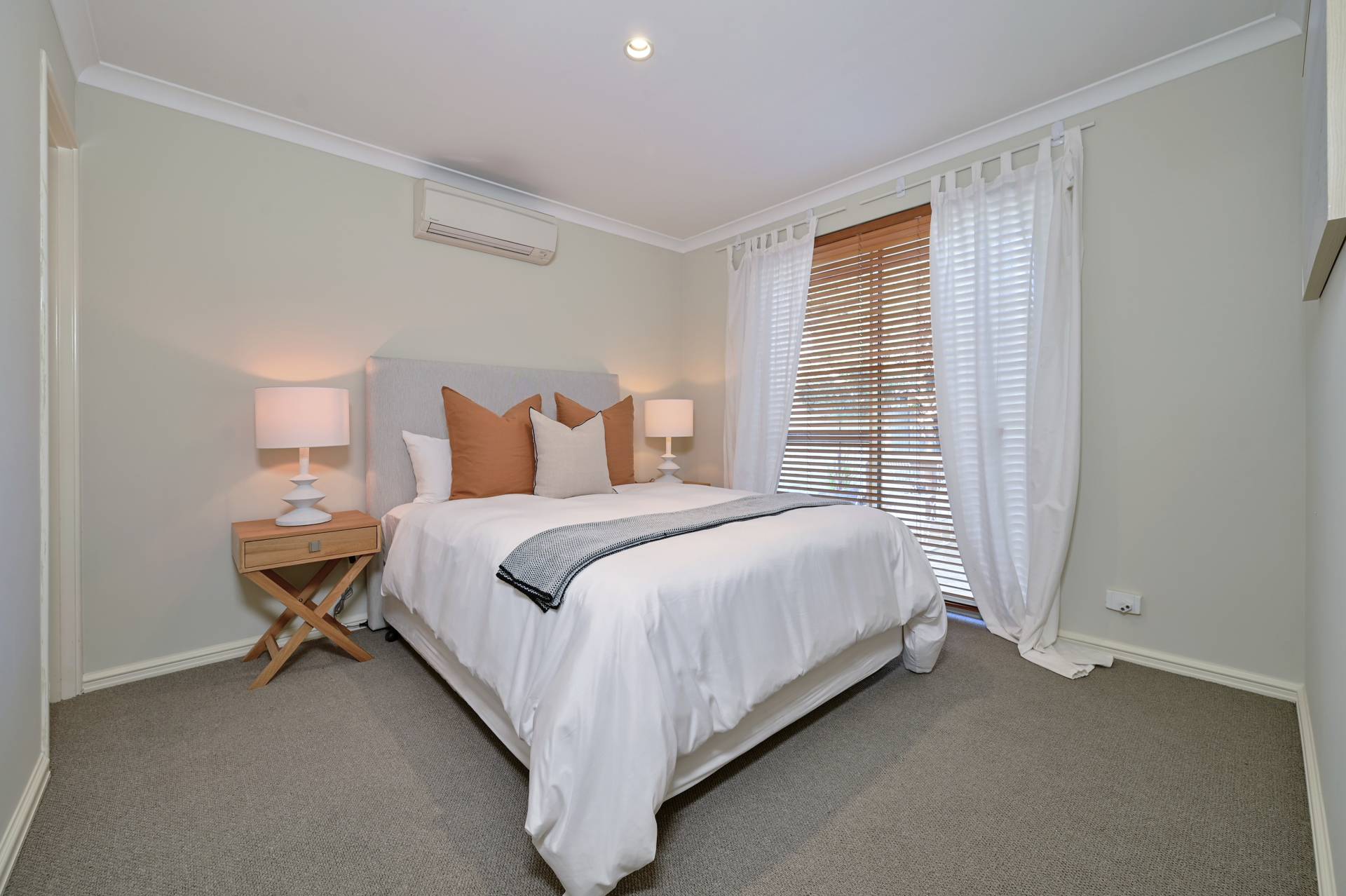 The master suite is the largest of the three bedrooms with its walk-in wardrobe and intimate ensuite bathroom – shower, toilet and vanity. Outdoors, a paved entertaining courtyard is generous in its proportions and is bordered by the most easy-care of garden settings. It really is the perfect place to either relax or sit and quietly contemplate life.