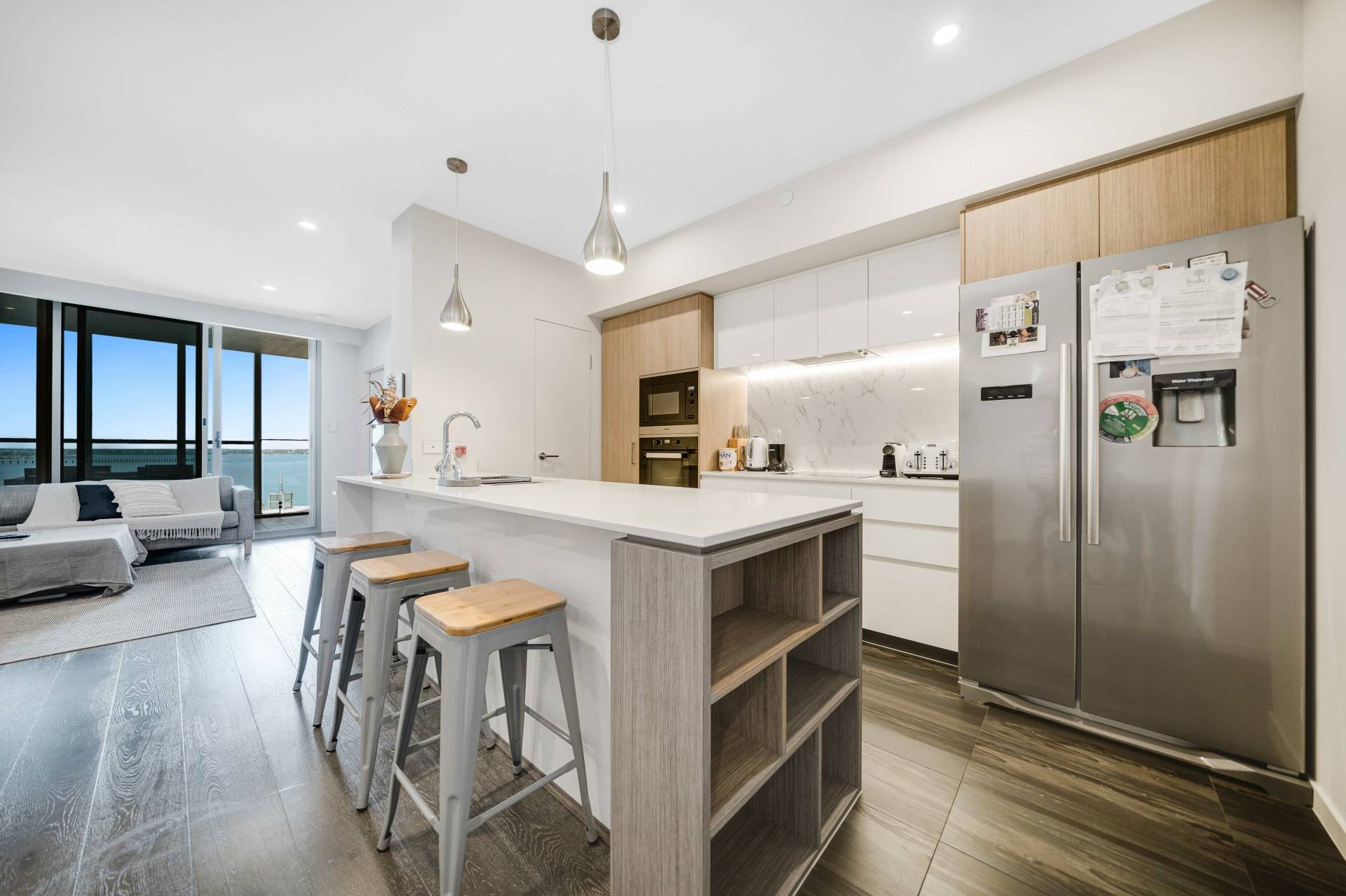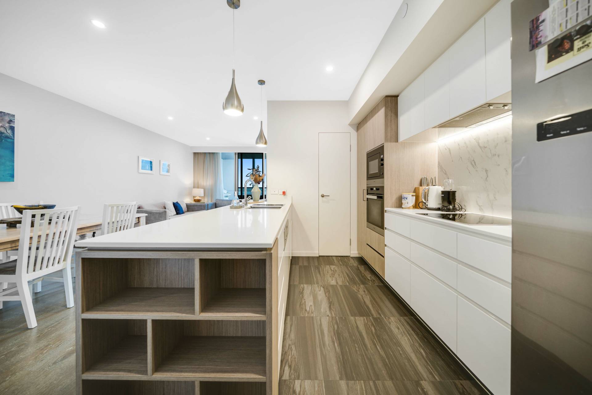 Coastal-inspired timber flooring throughout the open-plan living area and wall-to-wall windows and sliding doors create an airy, light-filled space with room to entertain friends and family.