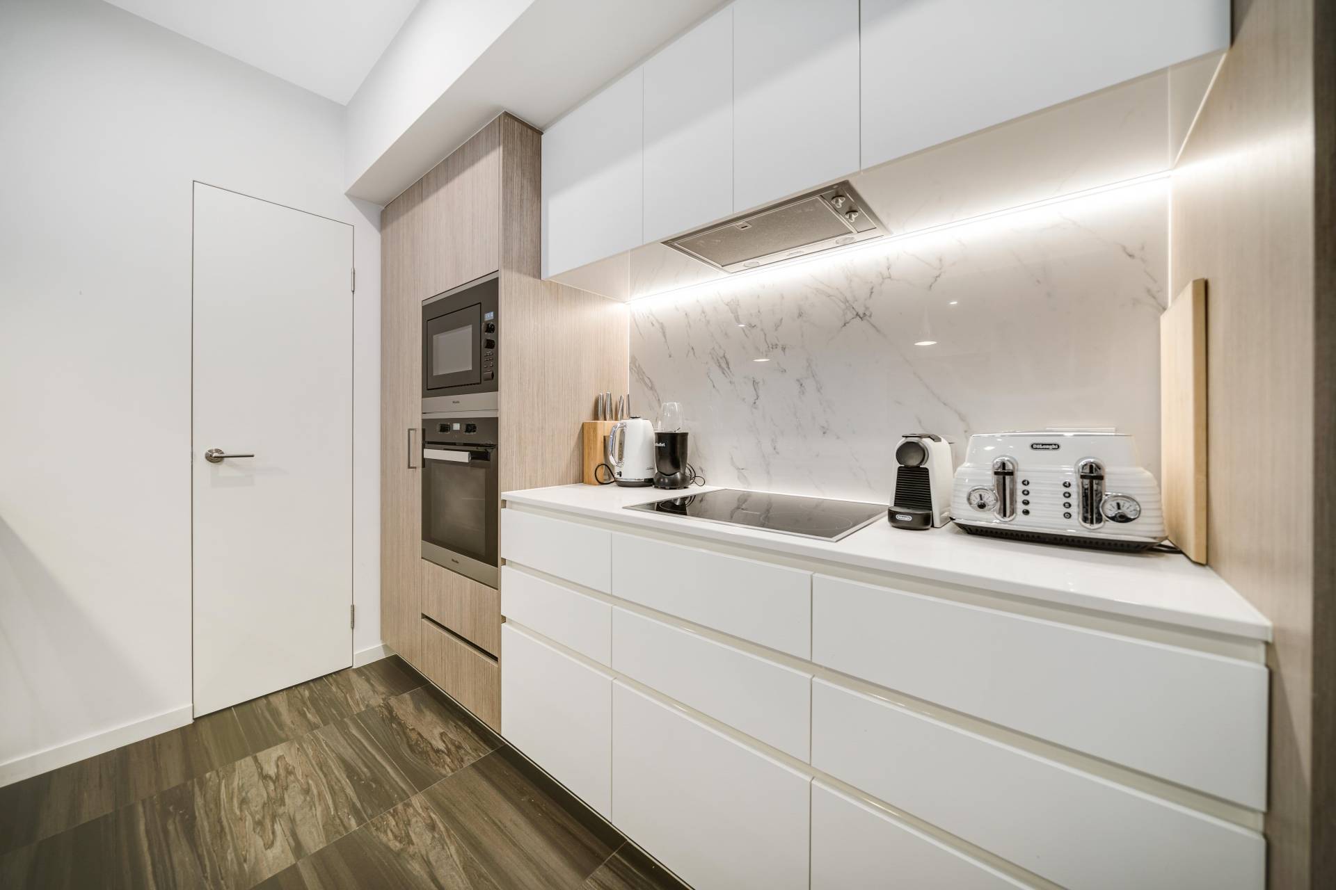Your sleek, contemporary kitchen includes engineered stone benchtops, soft-closing cabinetry and a double fridge/freezer recess. Top of the range Miele appliances include an integrated dishwasher and microwave, induction cooktop and conventional wall oven. Chic pendant lighting over the benchtops, a marble splashback and a customised walk-in pantry complete this space.