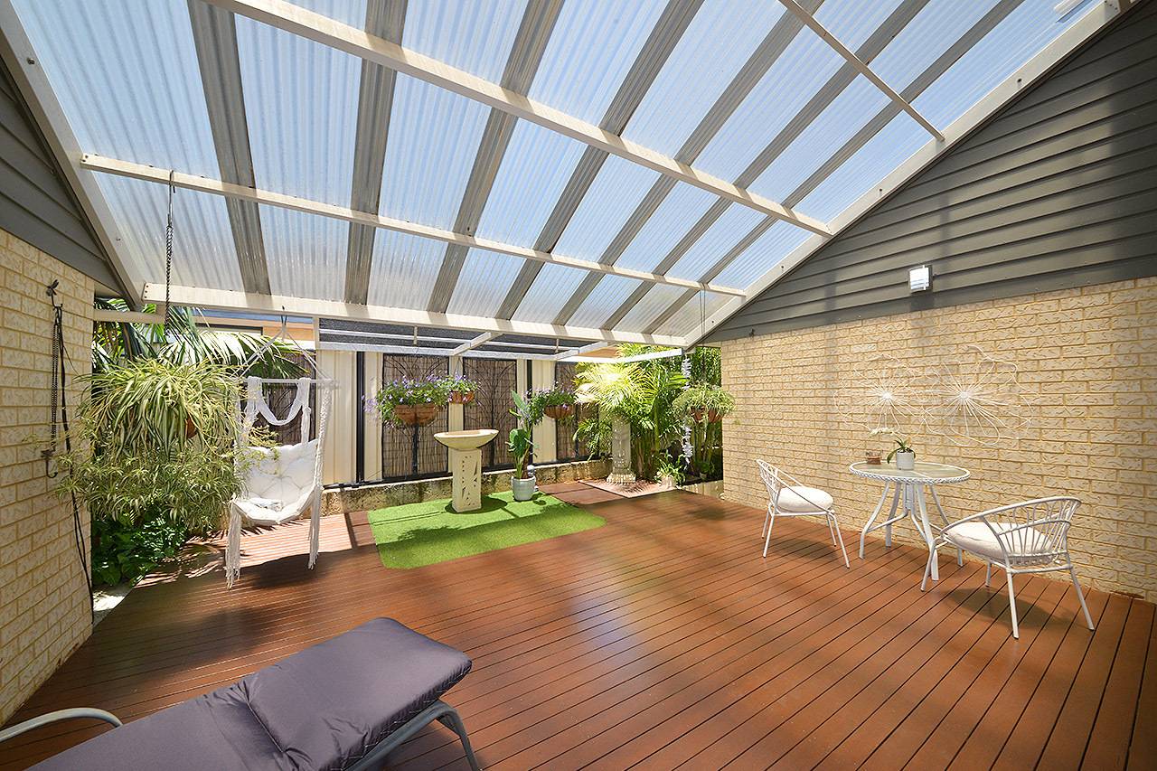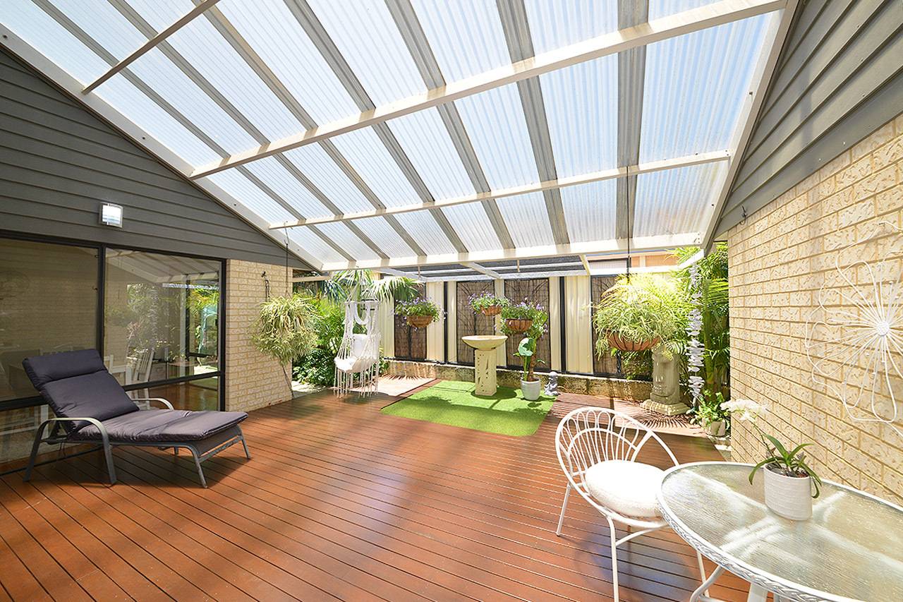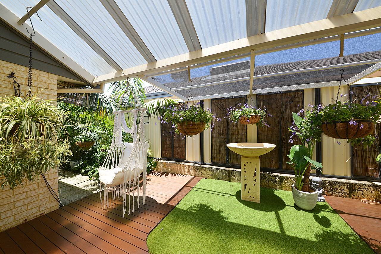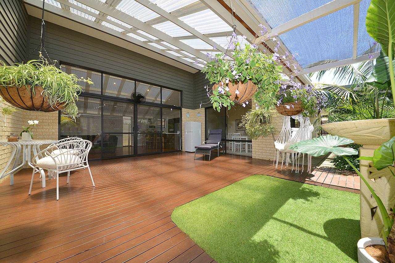 A superb alfresco entertaining area with feature raked patio, wood decking and ceiling fan, all overlooking magnificent gardens