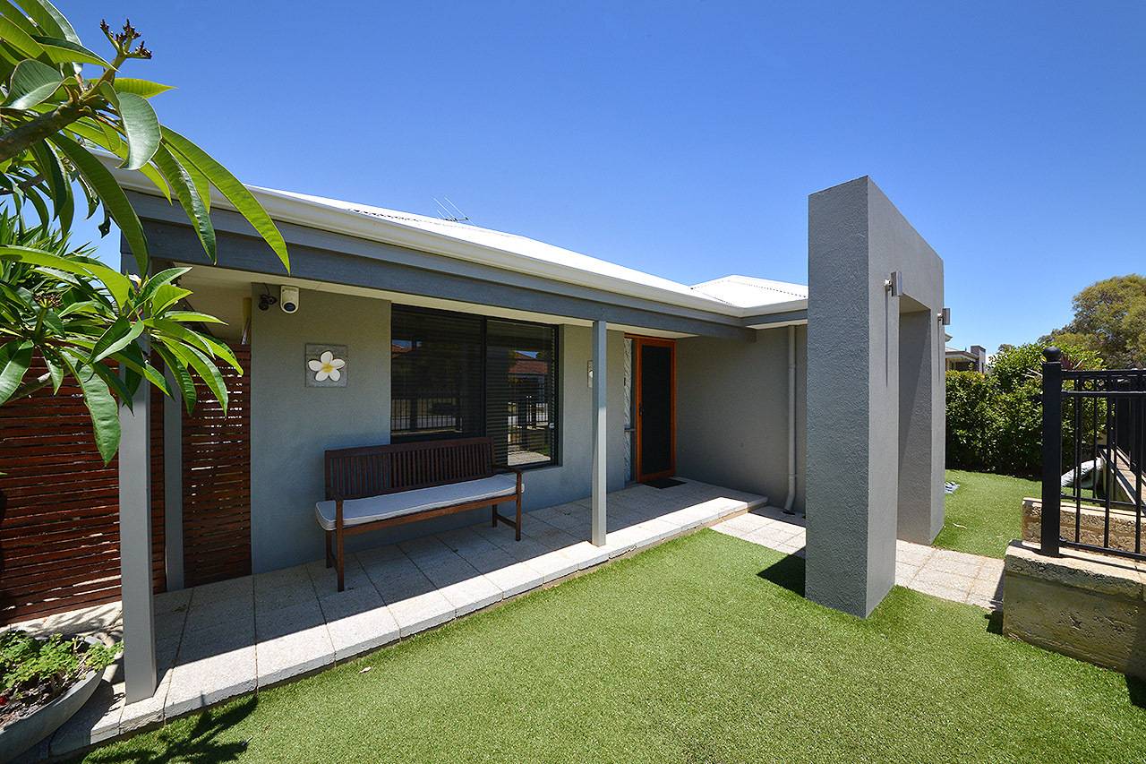 Modern frontage with feature portico entrance, stylish paving and fencing, plus easy care synthetic turf and gardens