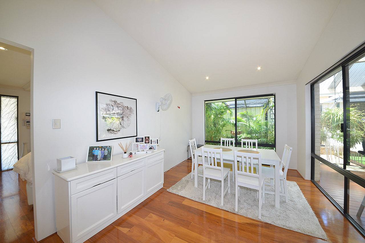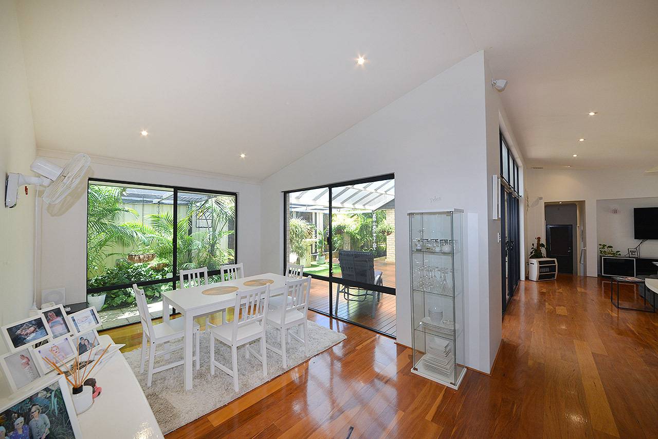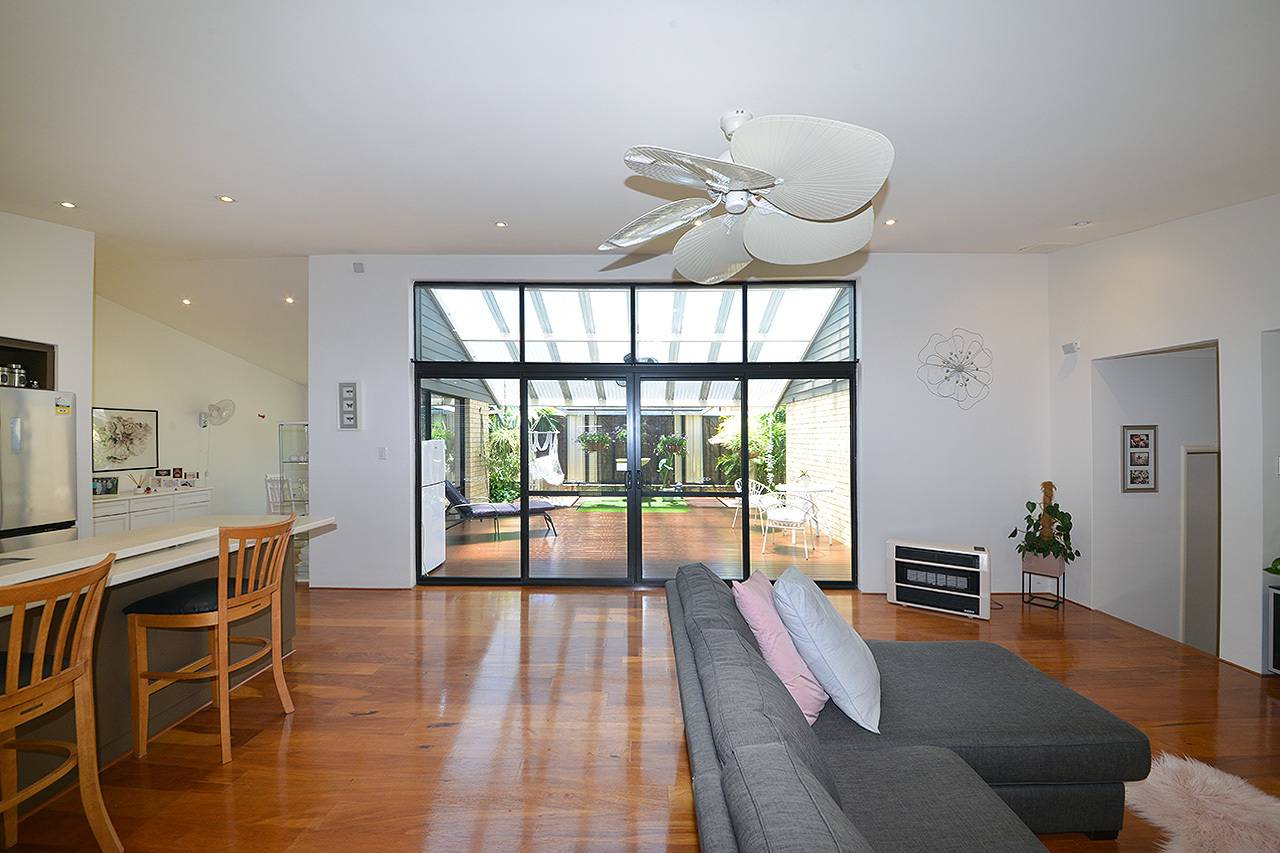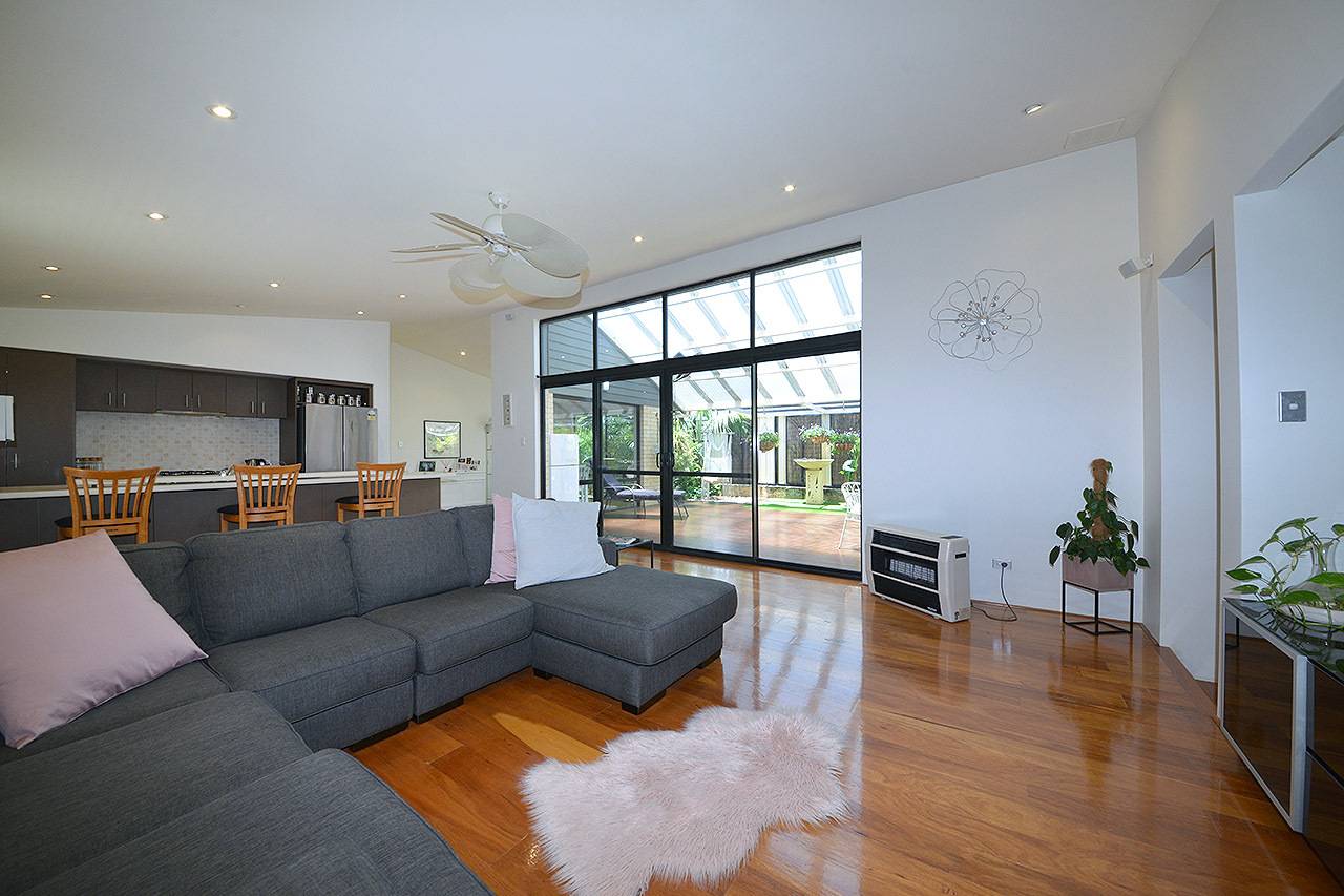 Well designed open plan meals and living rooms with extra high raked ceilings, TV recess, ceiling fan and double sliding door access to outdoor alfresco