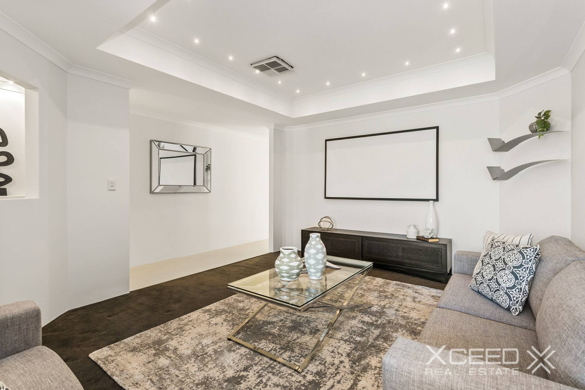 Formal lounge/theatre room with a recessed ceiling and feature lighting