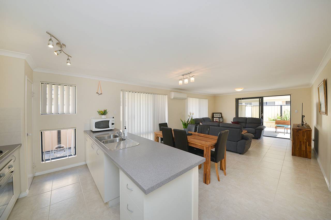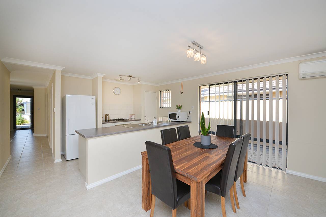 Open plan meals and living rooms with split system air-conditioning and sliding door access to outdoors