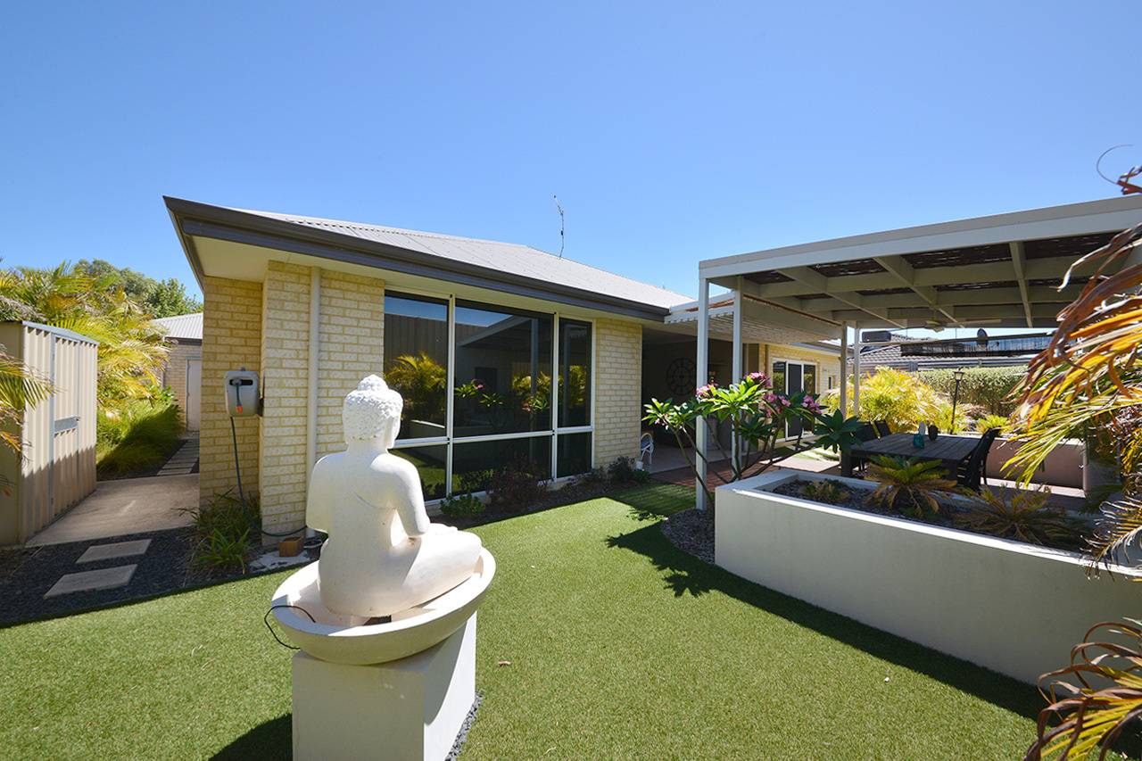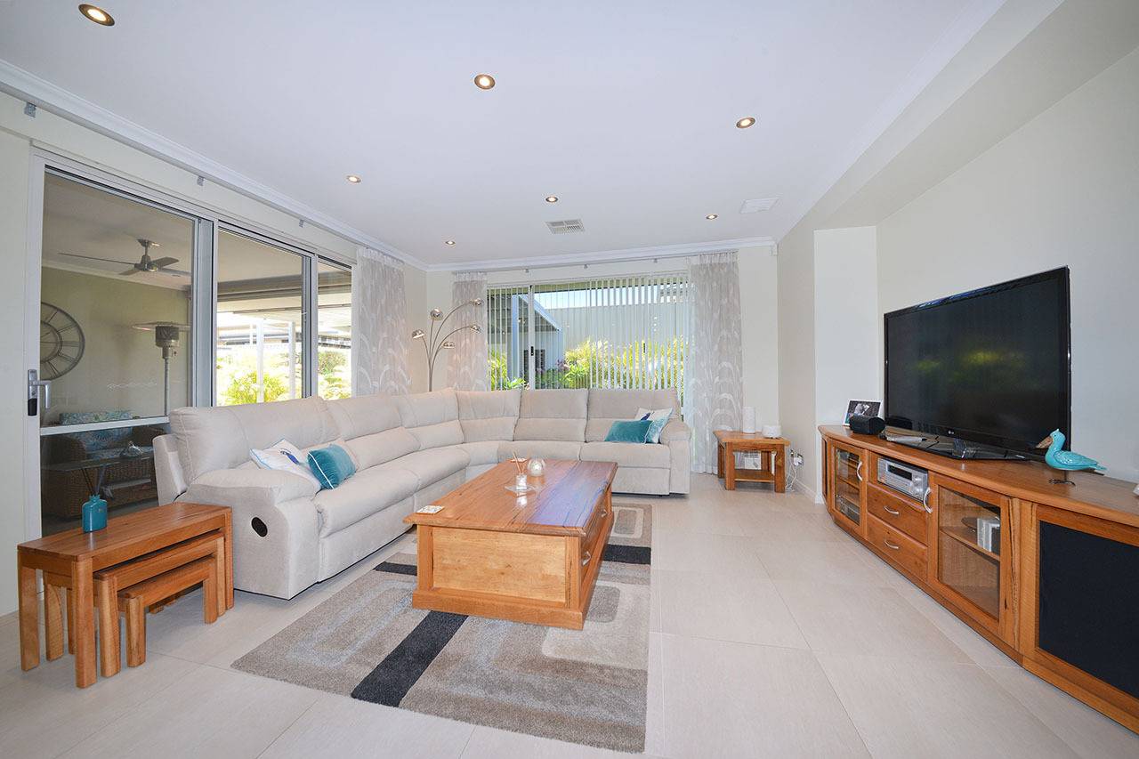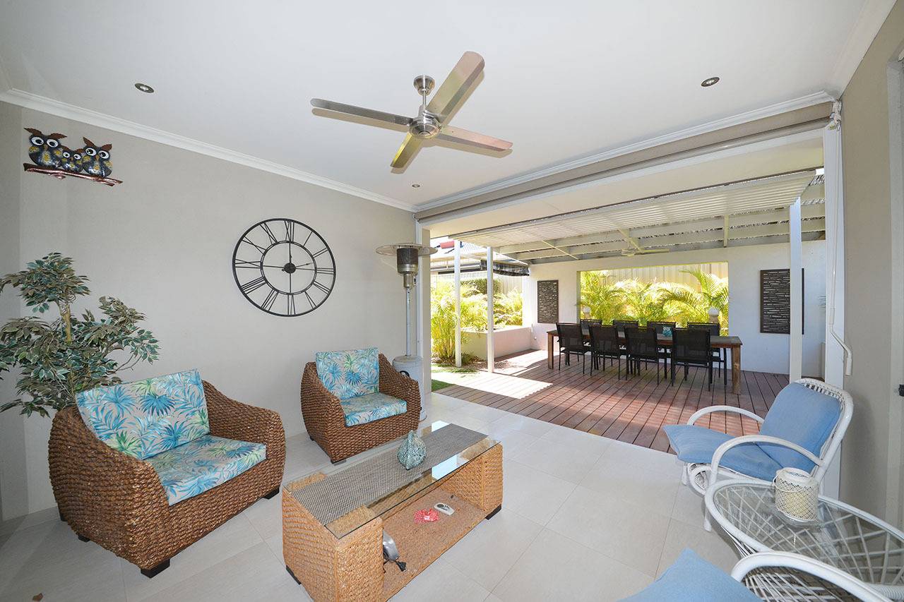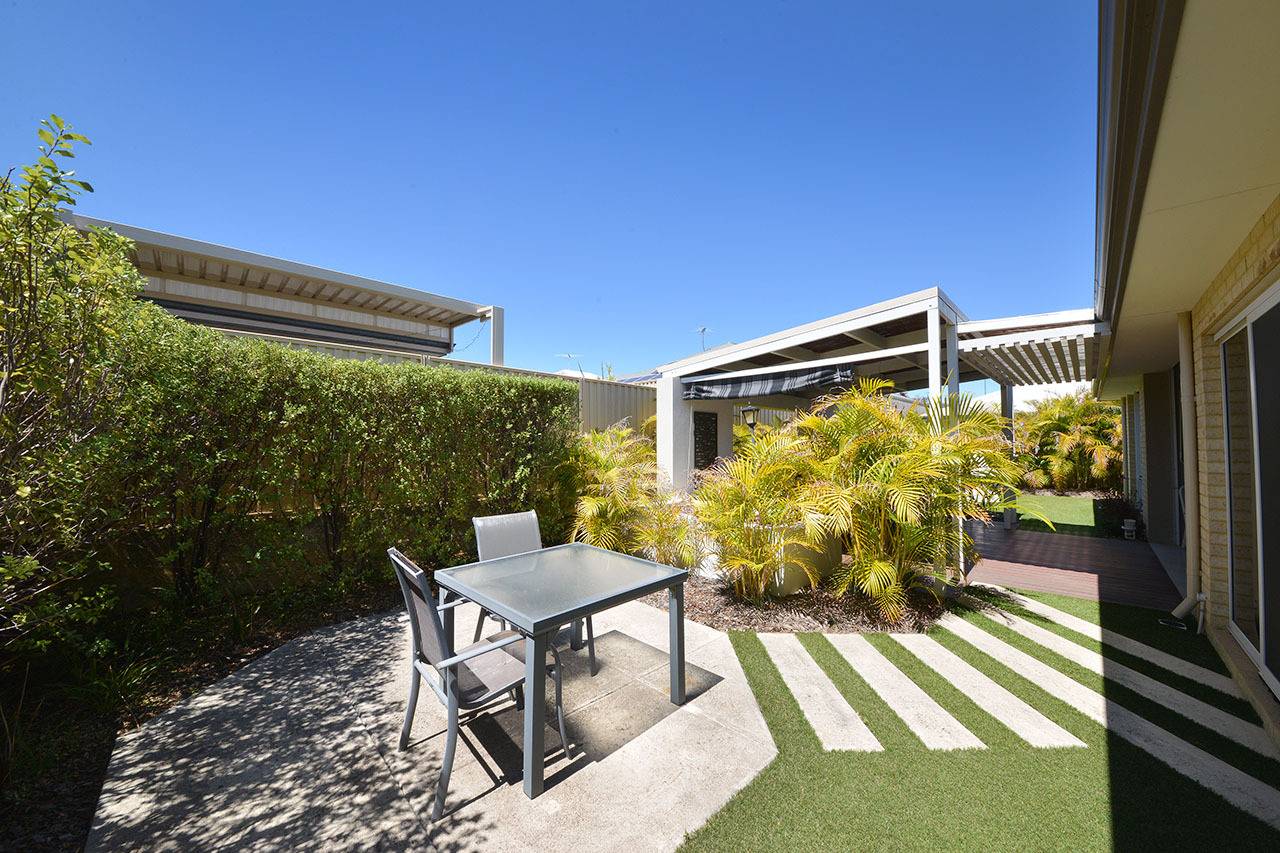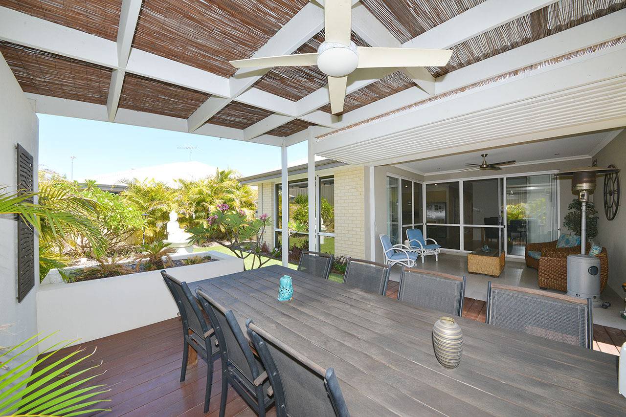 Stunning alfresco with feature tiled floor, ceiling fan and roll down café blinds leading onto extra pergola entertaining area with wood decking and feature walls all surrounded by easy care gardens and synthetic lawn