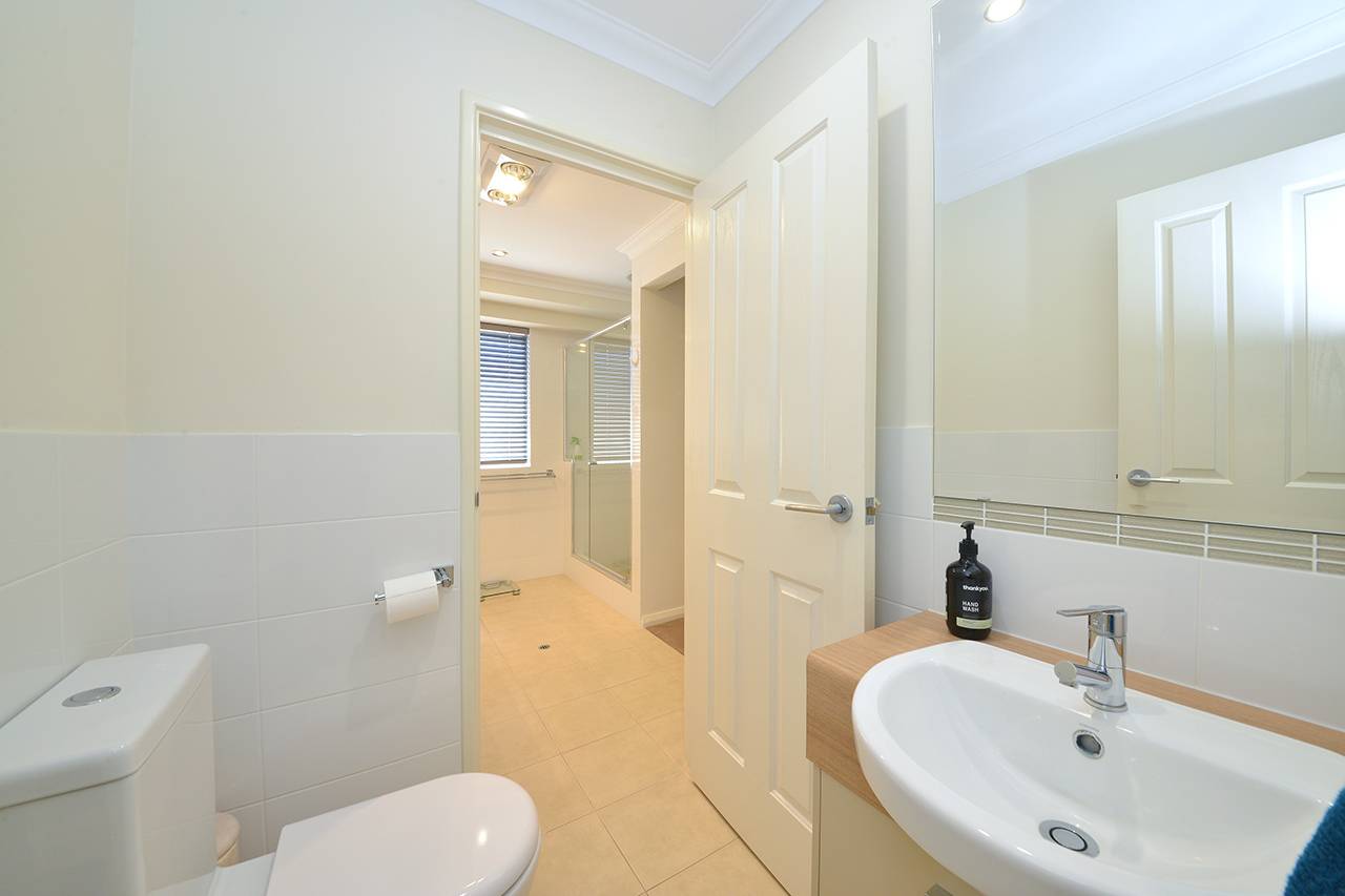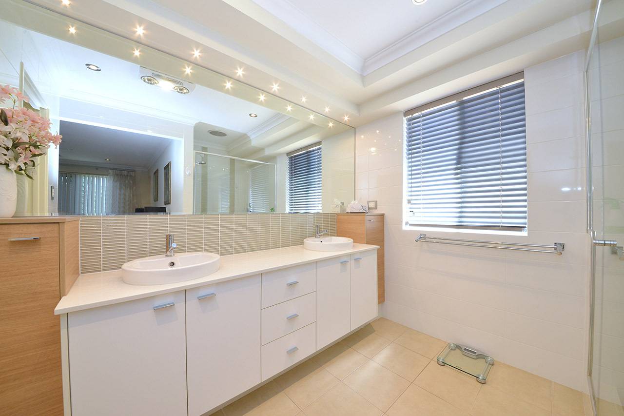 Superb ensuite with stylish full height tiling, extra-large shower (with glass screen), twin vanities with stone benchtops, feature lighting and heat lamp,  all with ample room to move