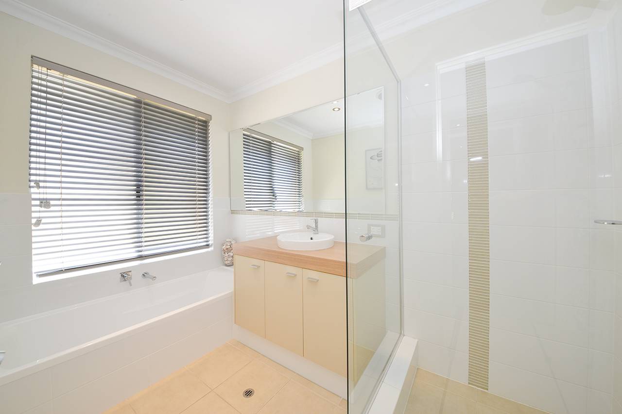Modern 2nd bathroom with vanity, shower with glass screen and bath