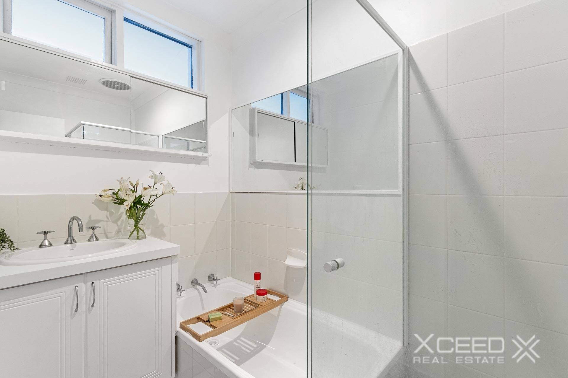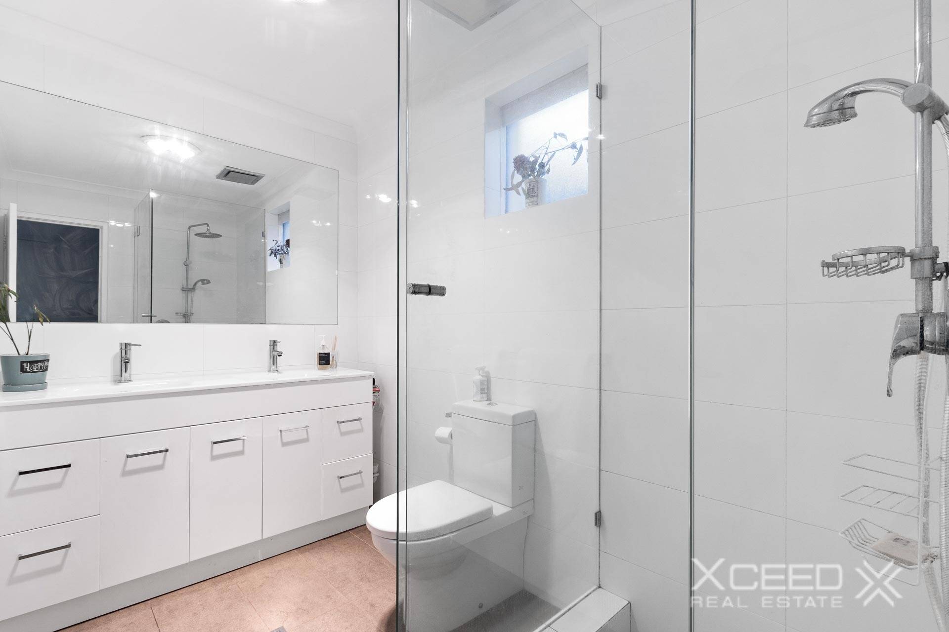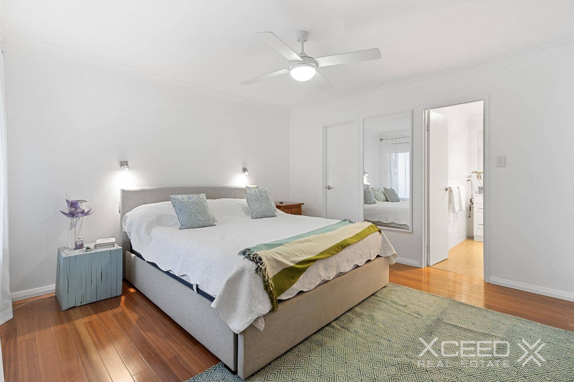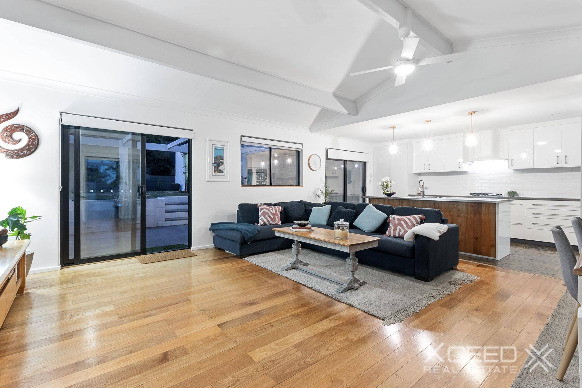 The main living area is dual aspect, with three sets of double glazed sliding doors; one leading to the front terrace with views over the neighbourhood and private reserve, whilst the other leads to the back with an outdoor terrace lined with a timber pergola, and large undercover pitched alfresco. The back garden is conveniently landscaped with mature flower beds and lawn. The hidden gem is a powered brick studio in the back garden – an ideal sanctuary to work from home.