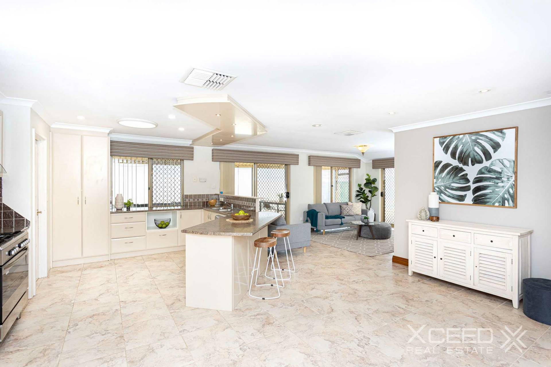 Inside, marble-look floors, wooden skirting boards, white painted walls, natural light make the living space ooze retreat feels.