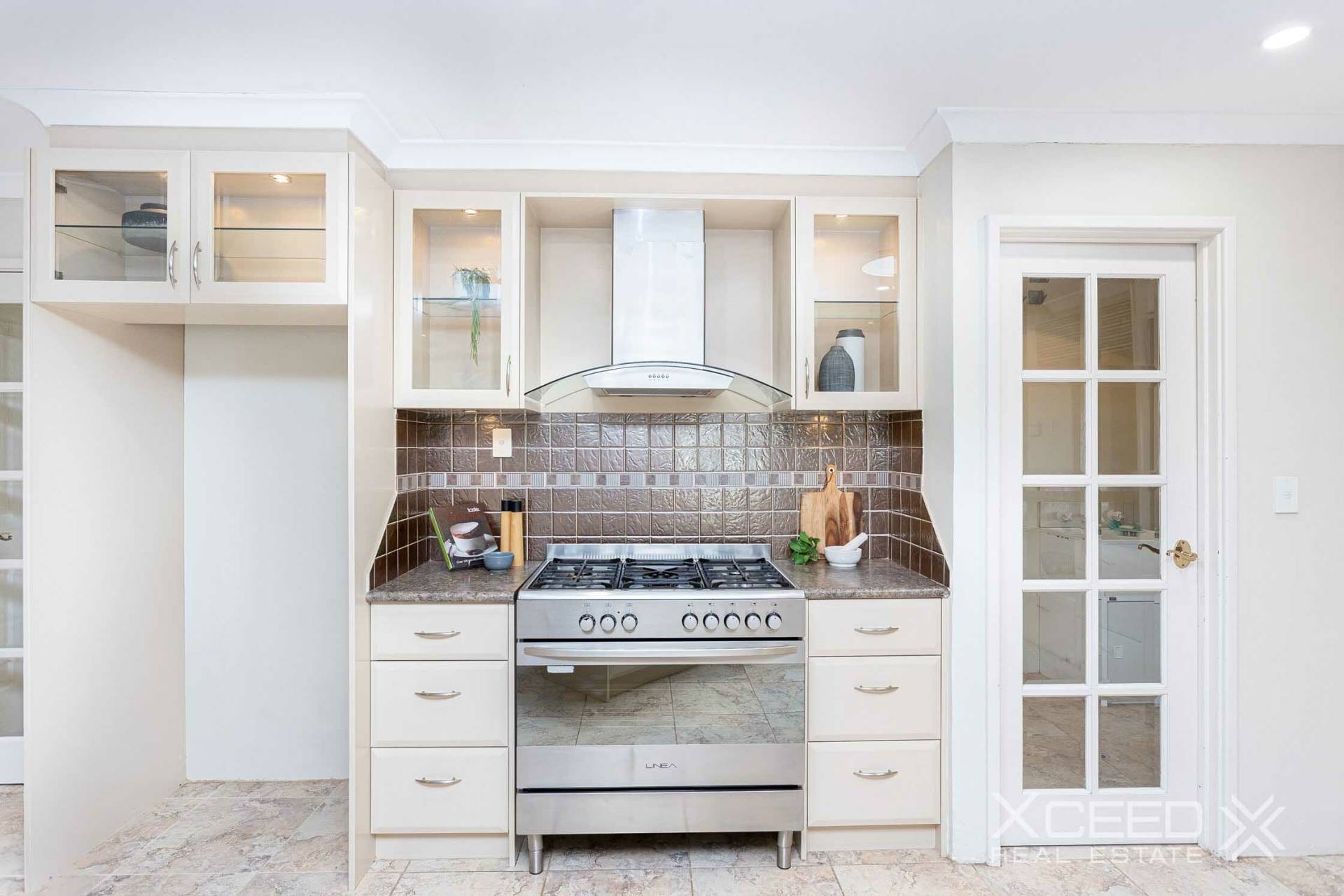 Prepare a meal while being at the heart of the home – the kitchen – standing behind its generous benchtop space doubling up as a breakfast bar. Behind it, the kitchen's grey-tiled splashback, dark grey tops, and white and glass cabinetry give it a Hamptons feel. Stainless steel appliances include an oven, gas cooktop and dishwasher.