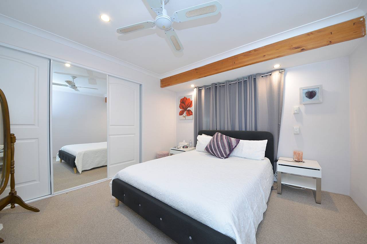 Spacious master bedroom with triple sliding door robe and ceiling fan