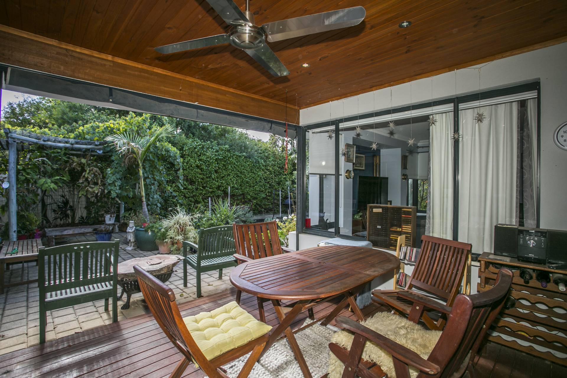 ·         Decked patio with café blinds, a ceiling fan, timber-line ceiling and garden views