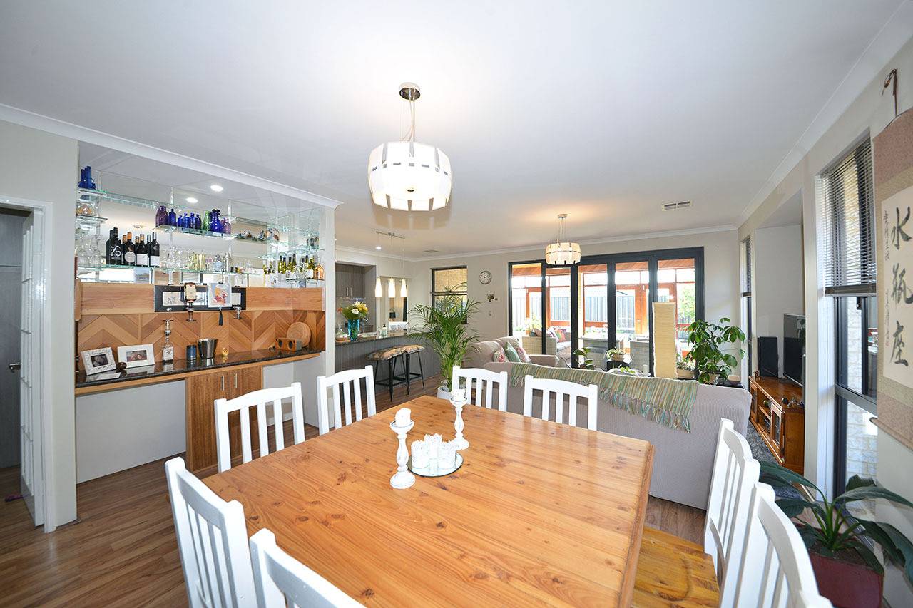Spacious open plan meals and living room with inbuilt bar area with bench, cupboards and feature glass shelving, high ceilings, TV recess and stunning bifold doors to outdoor alfresco