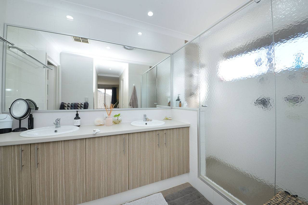 Modern ensuite full height tiling, extra length shower (with glass screen) plus full length bench and cupboards with twin vanities