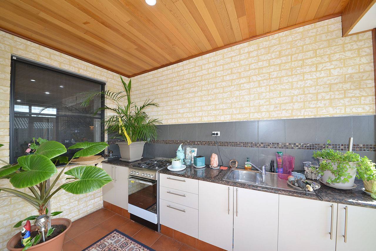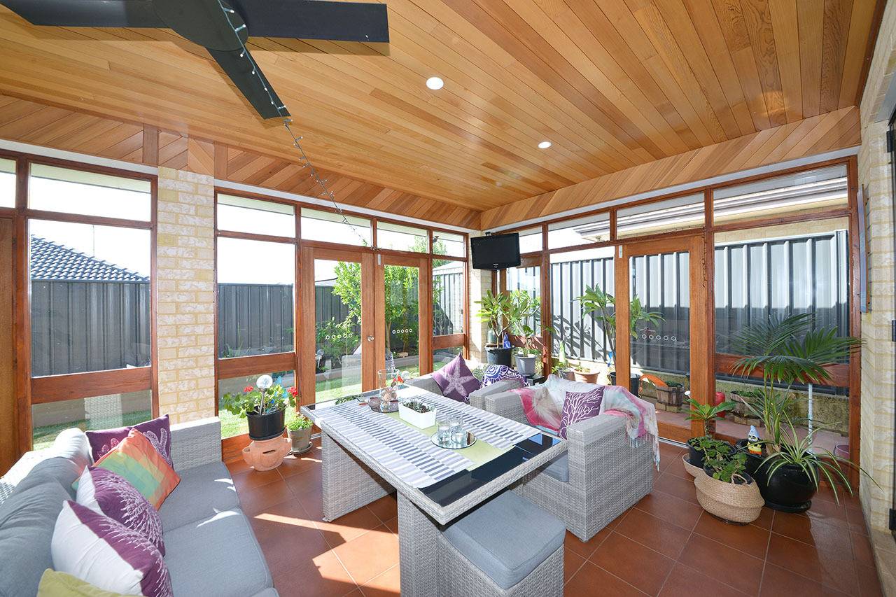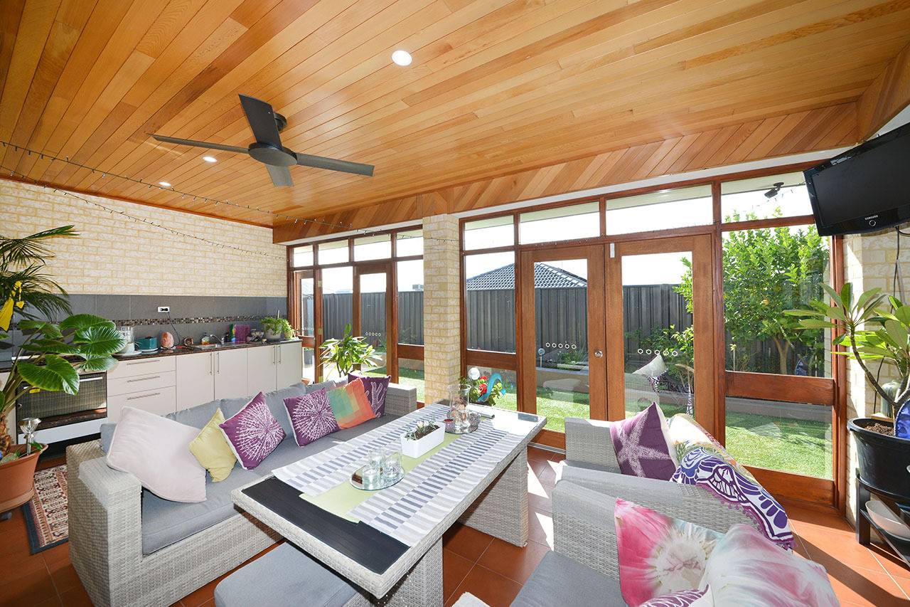 Sensational enclosed alfresco entertaining area (UMR) including inbuilt kitchen with sink, freestanding oven, bench and cupboards, stunning feature wood windows and doors and cedar lined roof with ceiling fan