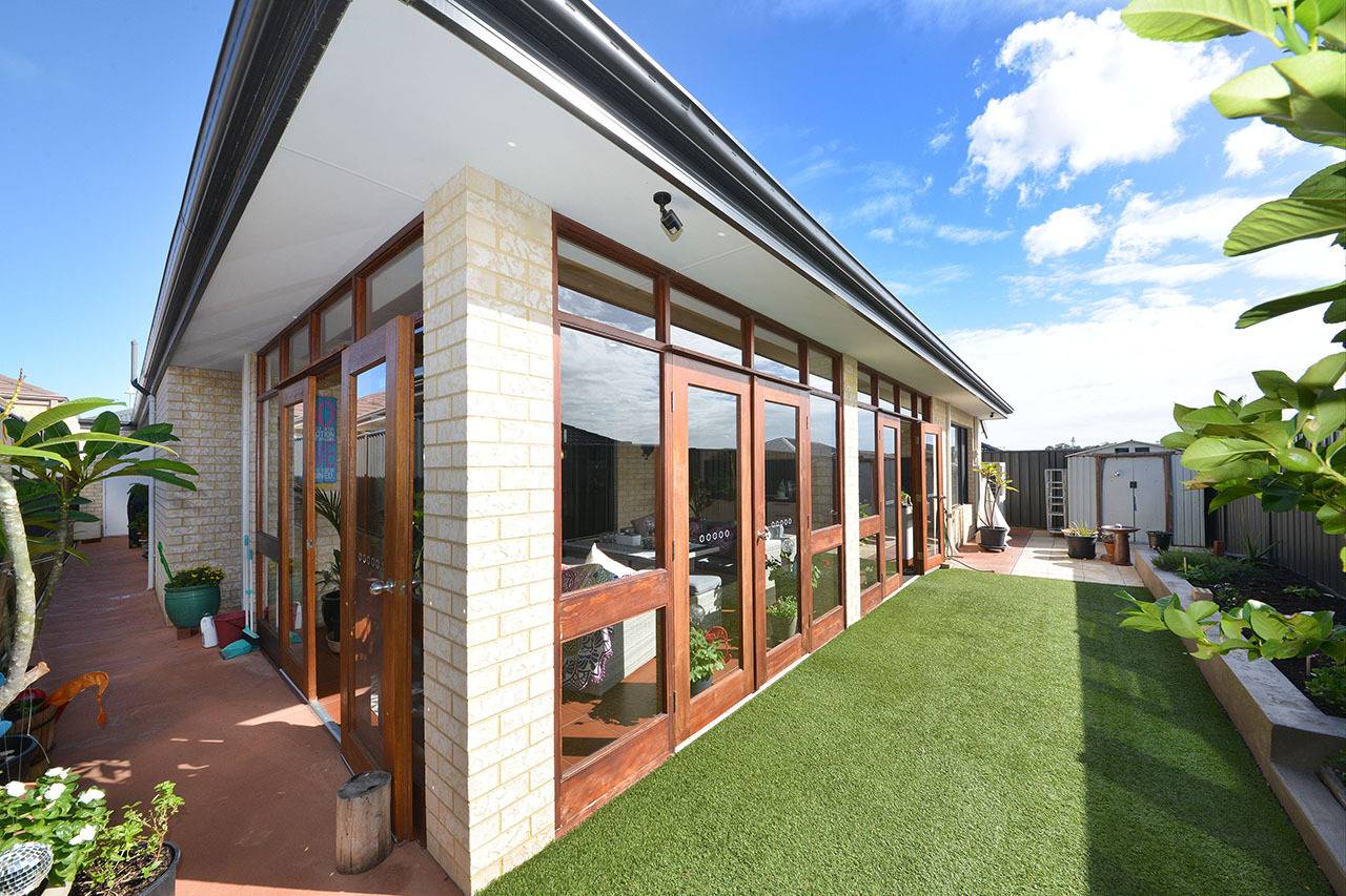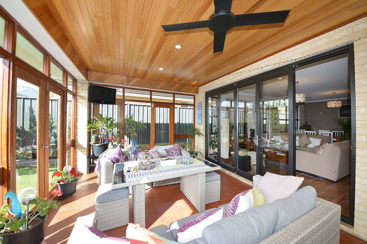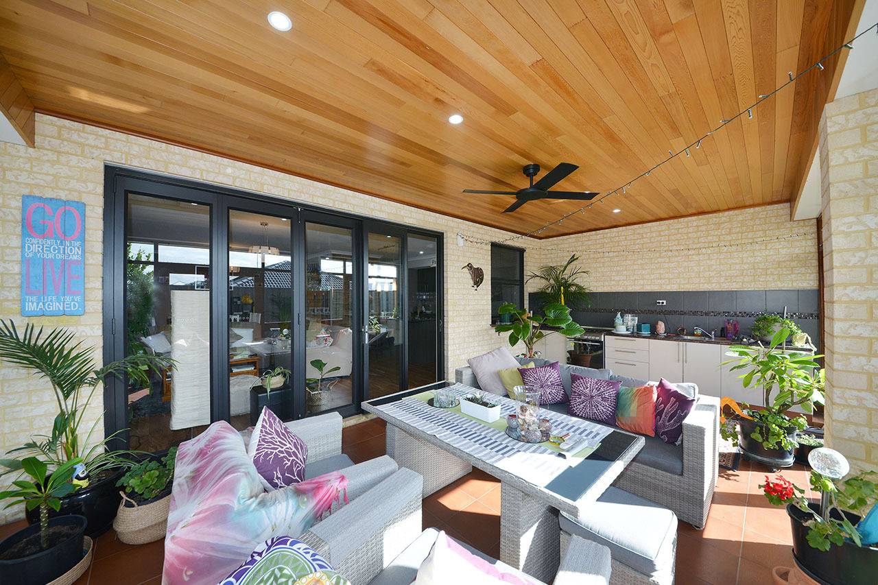 Sensational enclosed alfresco entertaining area (UMR) including inbuilt kitchen with sink, freestanding oven, bench and cupboards, stunning feature wood windows and doors and cedar lined roof with ceiling fan