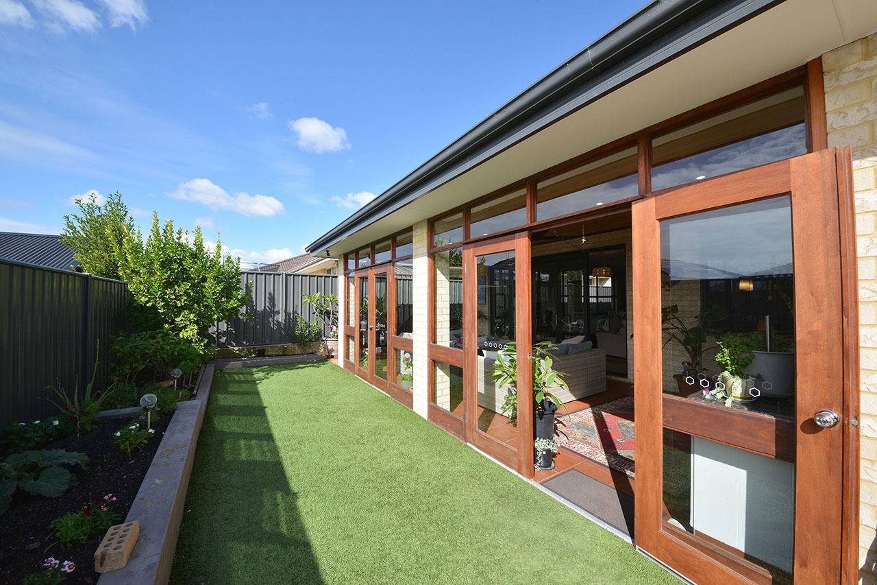 Stylish frontage with manicured gardens, synthetic turf and feature wood decking to solid door entry with security screen