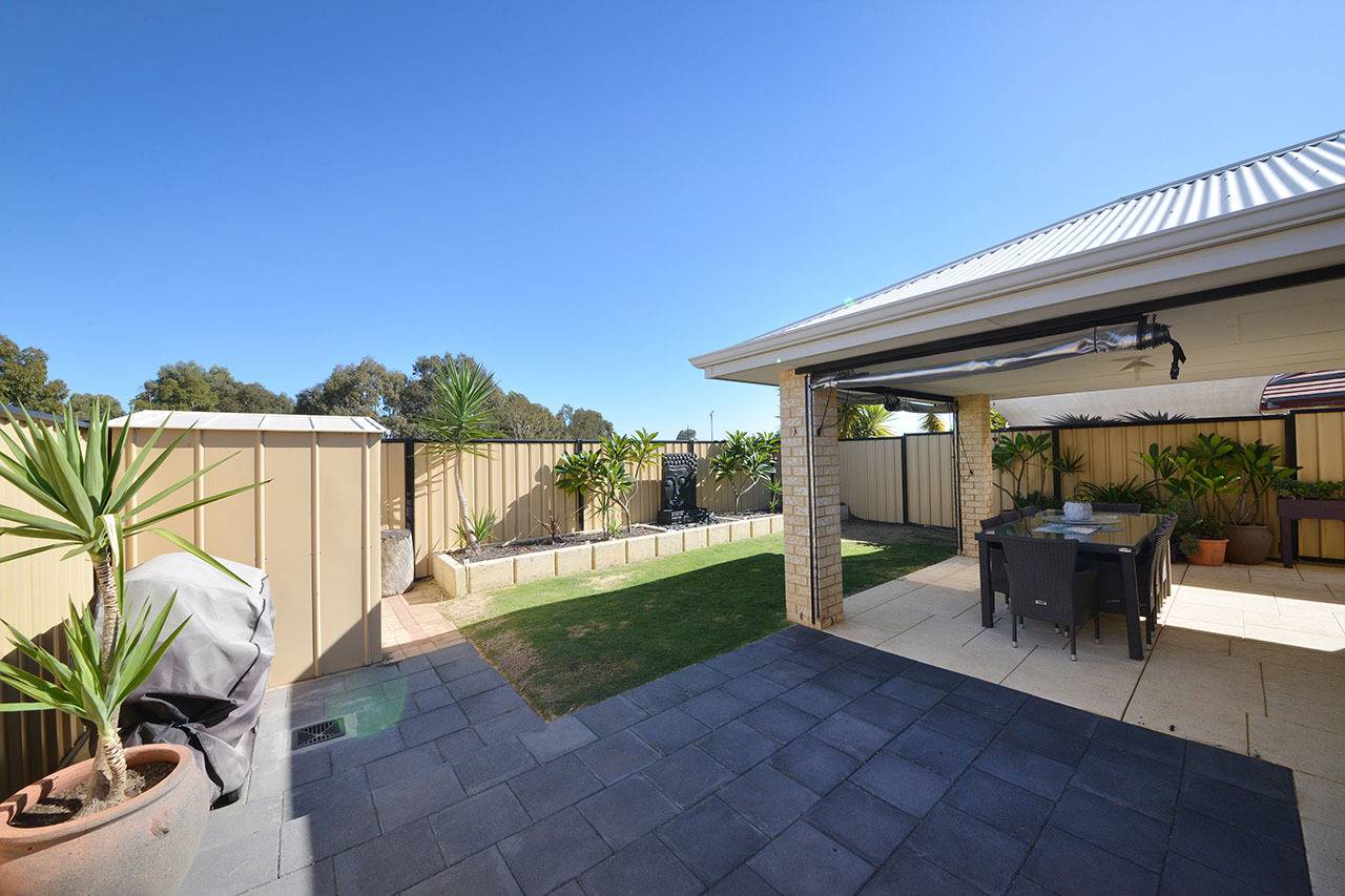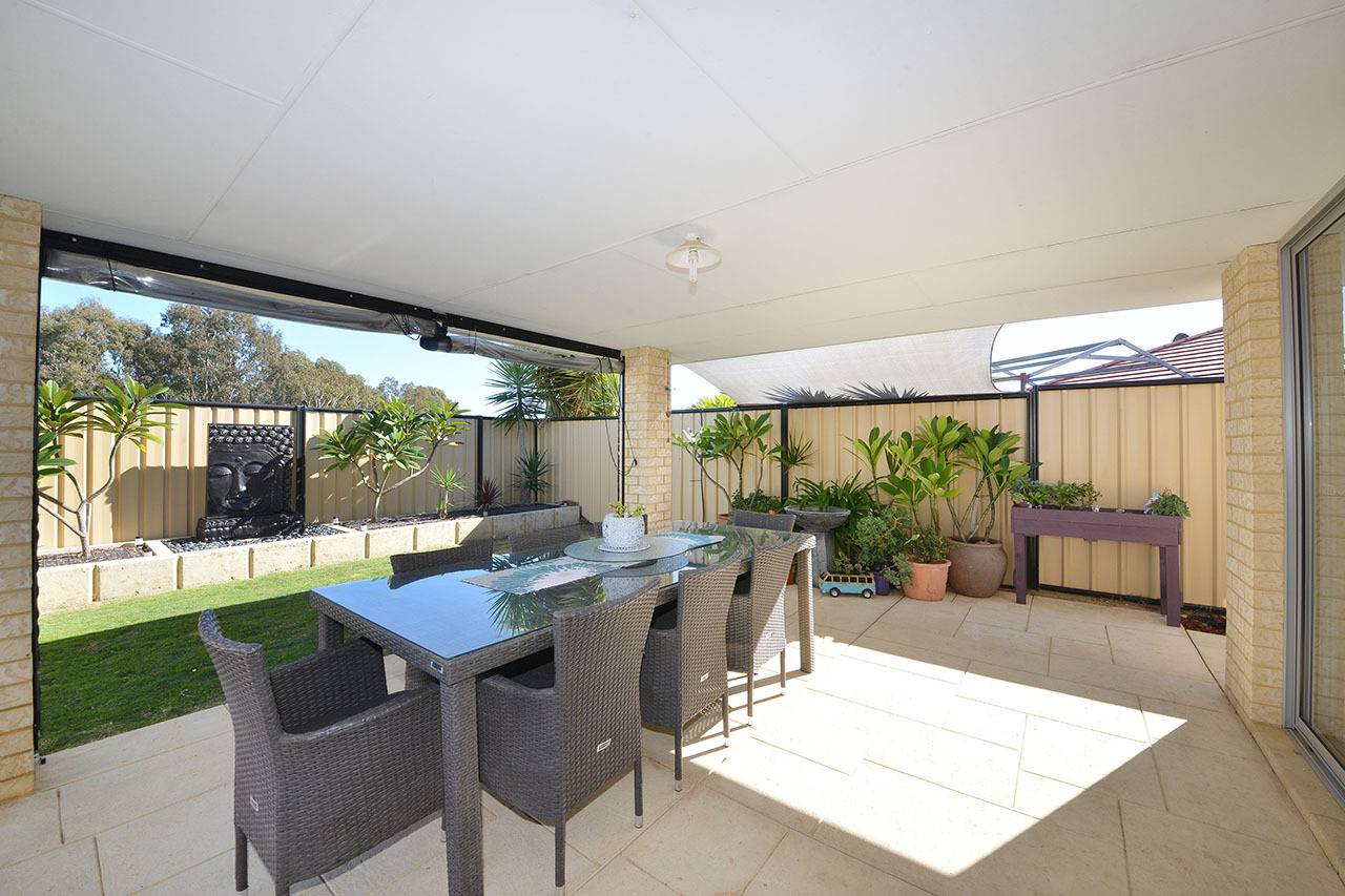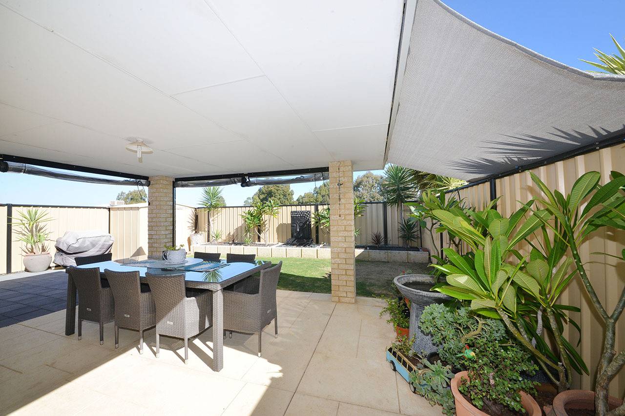 Alfresco entertaining with stylish feature paving and roll down café blinds, all overlooking manicured gardens and lawn area