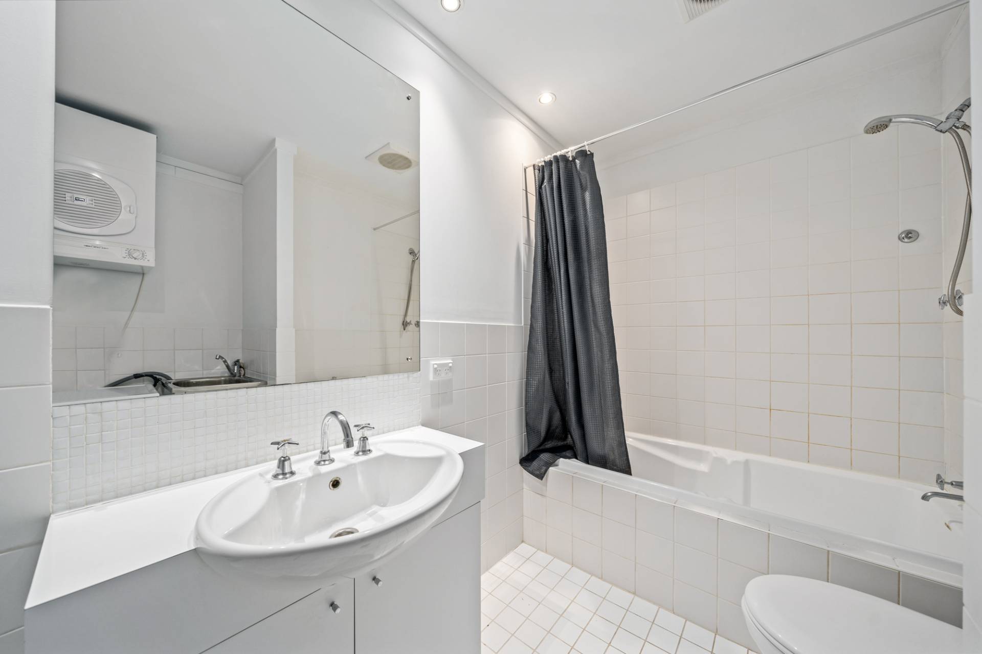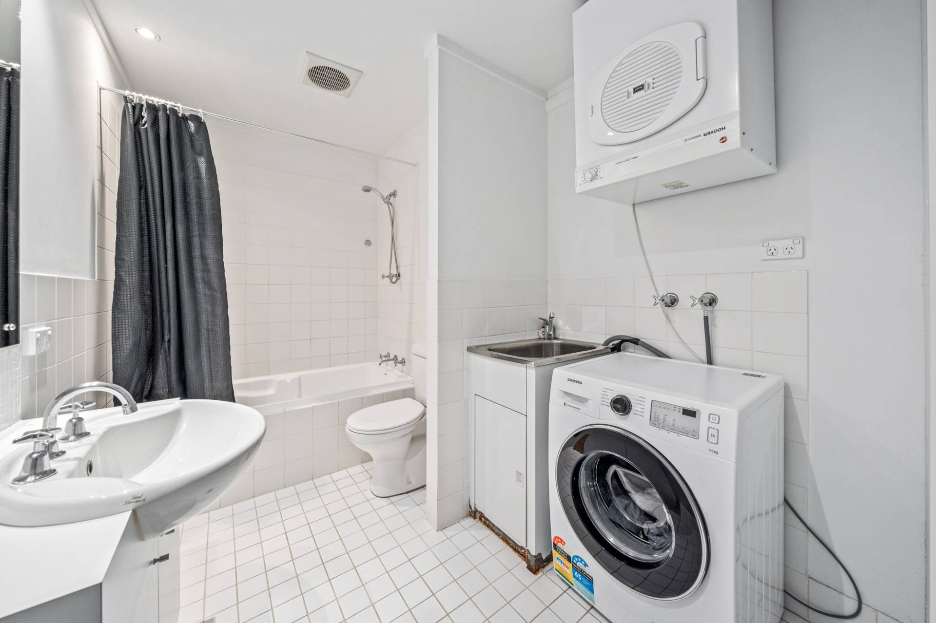 Double doors reveal a lovely private balcony off here – the perfect place to sit back, relax and take in the awesome city-skyline views. Making the most of the floor and wall space on offer is a combined bathroom-come-laundry with a bathtub, a showerhead, a toilet, a powder vanity, a wash trough and more.