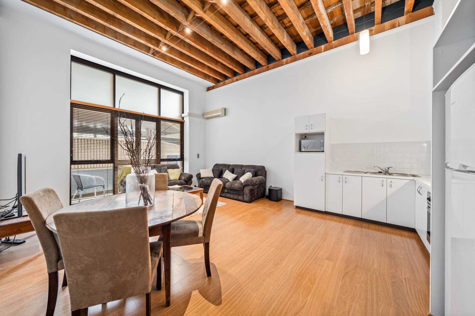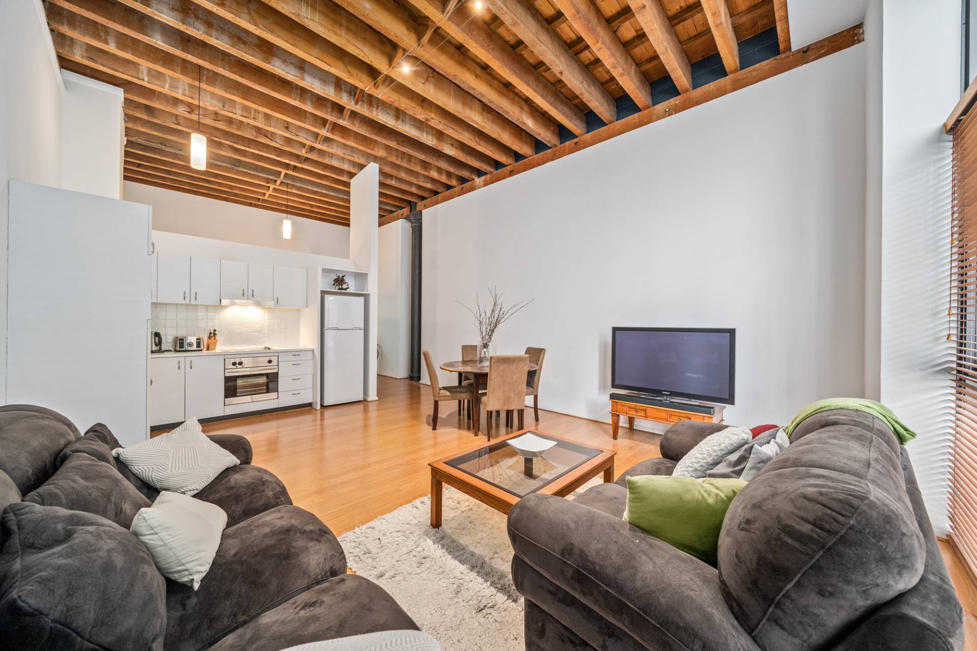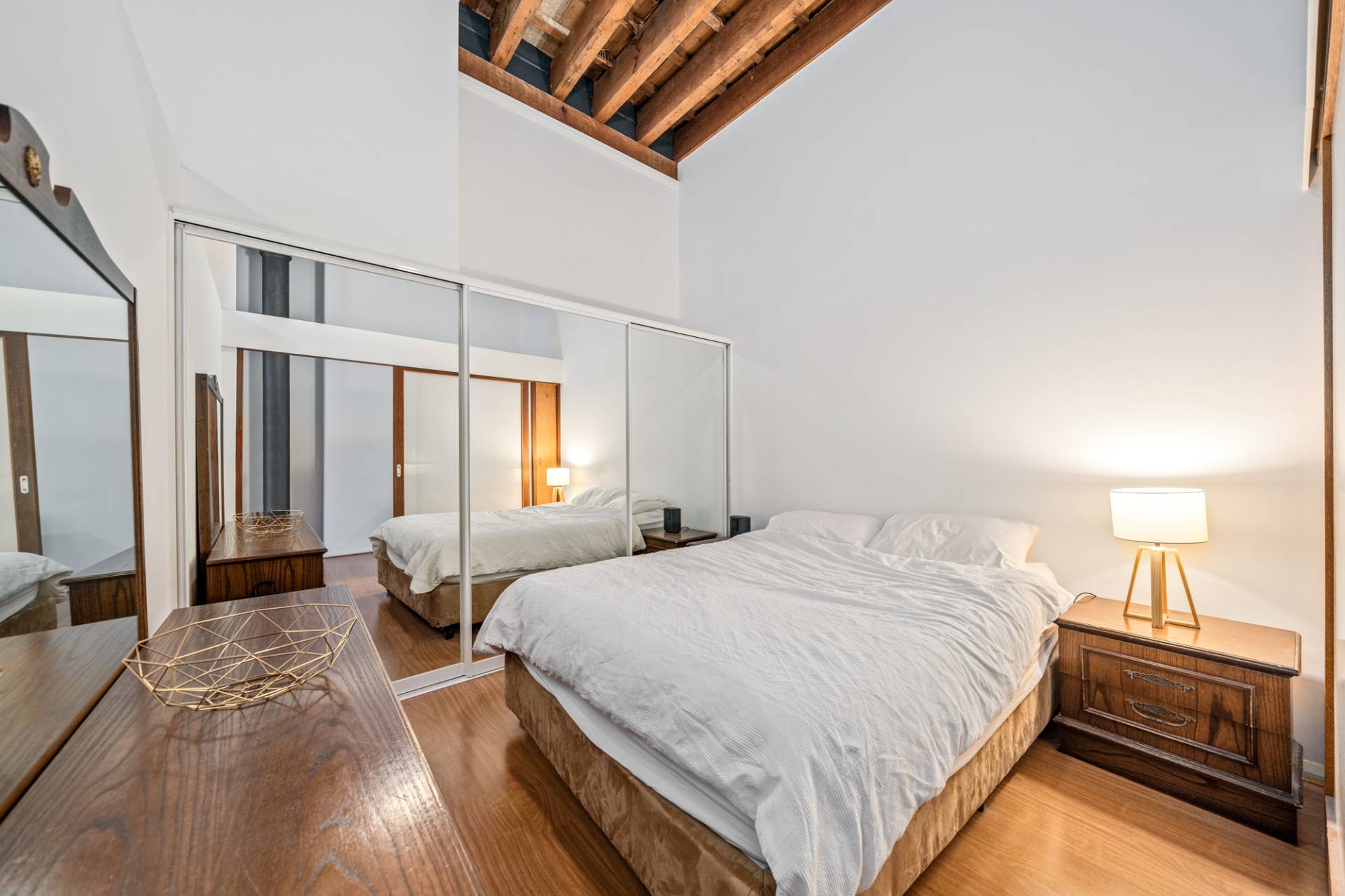 Wood-look floors and high raked timber-lined ceilings grace the bedroom here, along with mirrored built-in wardrobes. The theme continues into the open-plan living, dining and kitchen area where double sinks and a storage pantry meet tiled splashbacks and electric range-hood, cooktop and oven appliances.
