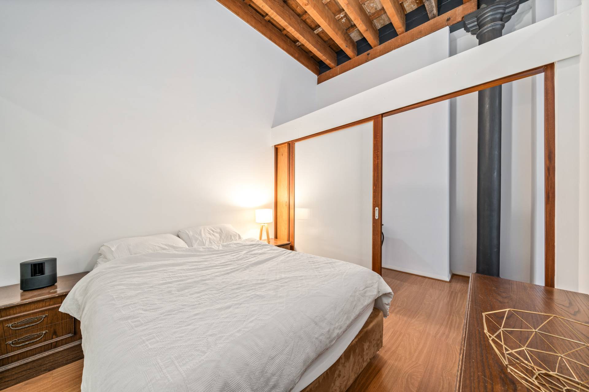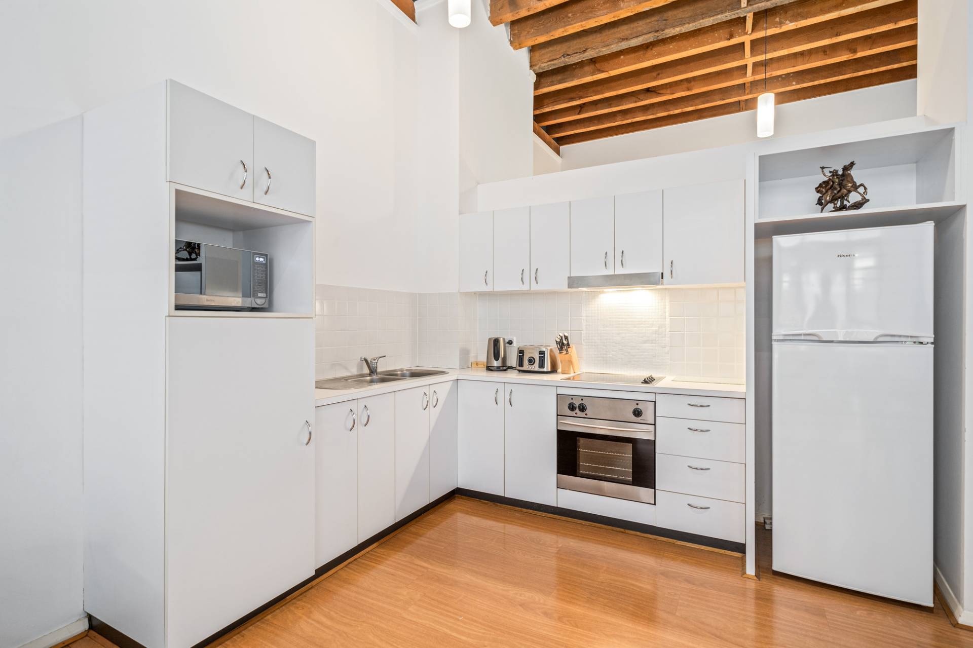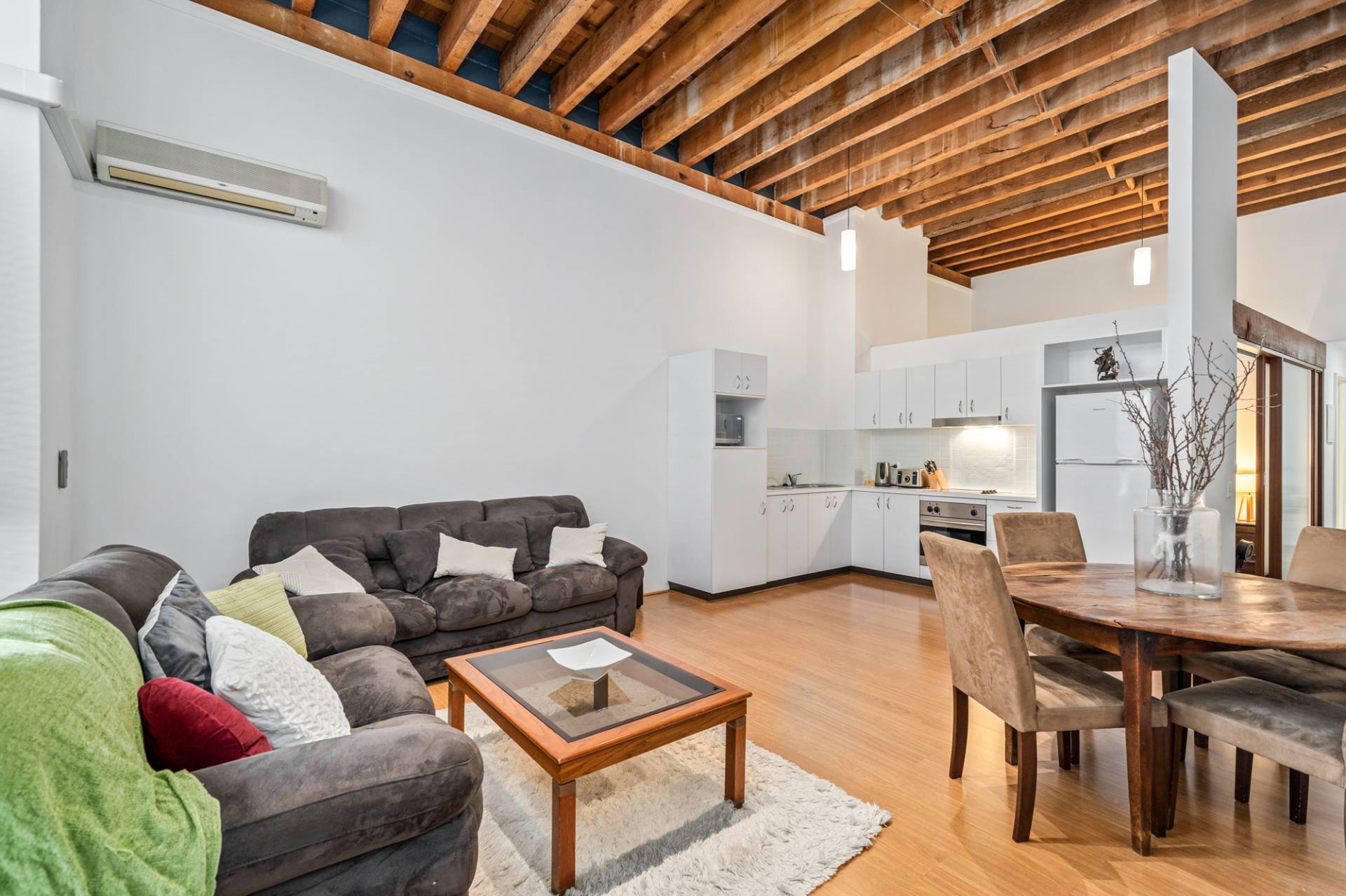 Wood-look floors and high raked timber-lined ceilings grace the bedroom here, along with mirrored built-in wardrobes. The theme continues into the open-plan living, dining and kitchen area where double sinks and a storage pantry meet tiled splashbacks and electric range-hood, cooktop and oven appliances.