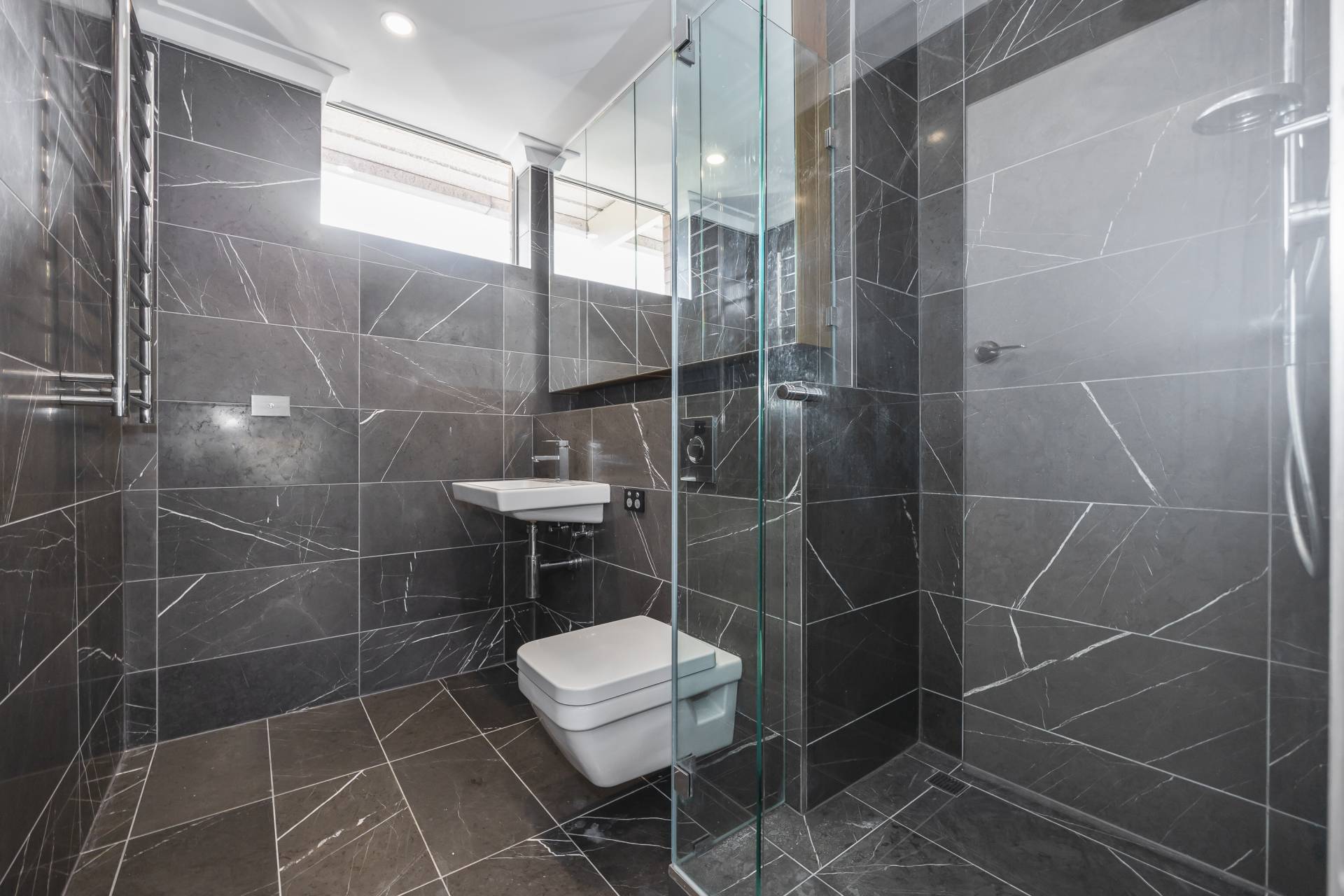 • Quality bathroom renovation with floor to ceiling tiling, heated towel rail and ample storage