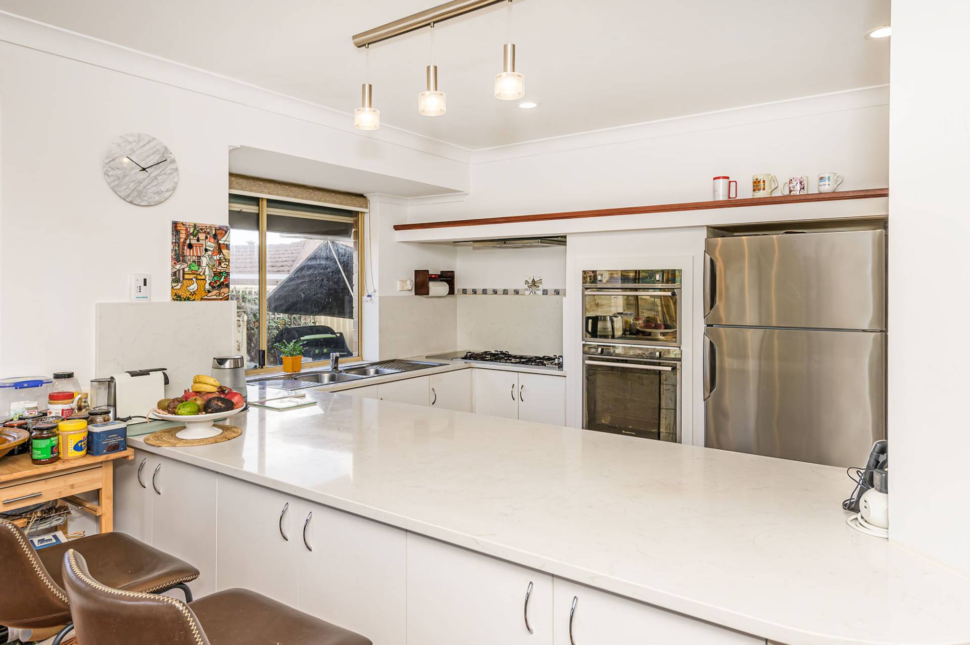 The entry corridor itself bypasses both rooms and leads to the kitchen and dining area, a bright welcoming space with sliding glass doors to both sides of the garden, a ceiling fan and plenty of room for a six-seater dining table. The bright, contemporary kitchen provides the convenience of a large breakfast bar, stone benchtops, double sink and gas stovetop, great for family rush hour.