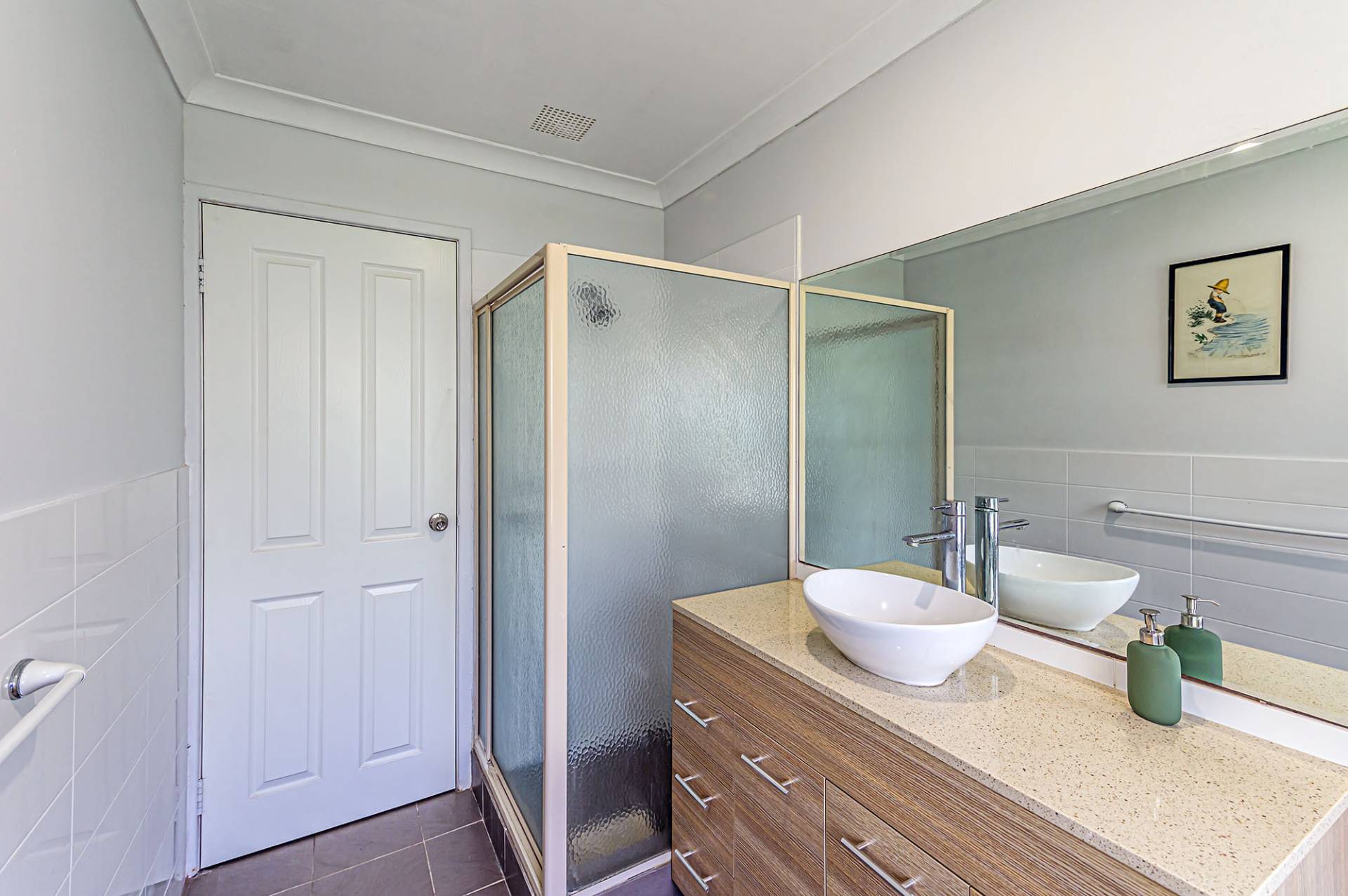 Down the hall at the rear of the property is the fifth bedroom with a ceiling fan, its own sliding door access to the rear garden and an ensuite bathroom with shower, vanity and WC. Elsewhere, there’s a good-sized laundry with separate outdoor access and space for both a washer and dryer.