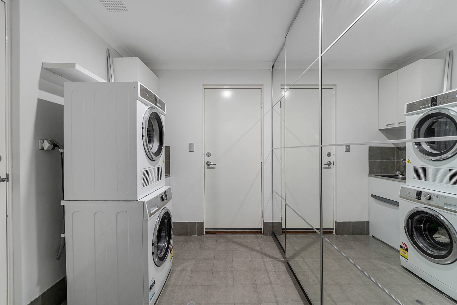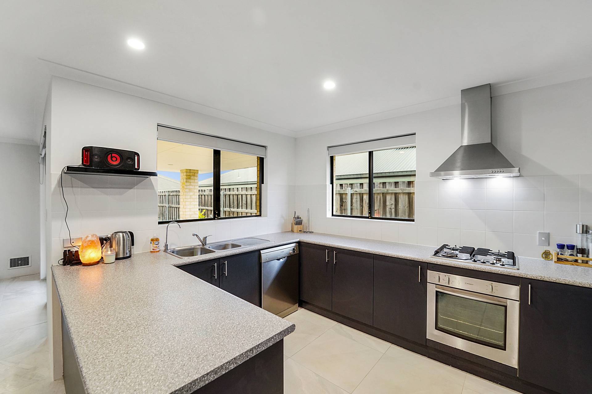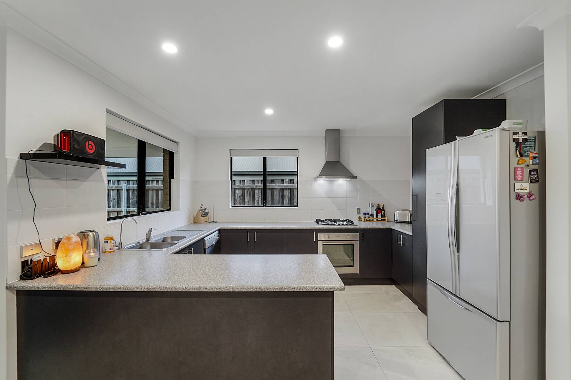 The u-shaped kitchen offers plenty of cabinets and bench space, glass splashback, and stainless steel appliances, including a dishwasher, electric oven, gas cooktop and canopy rangehood. There's also a double sink with a filtered water tap, a large fridge recess and a built-in double pantry.