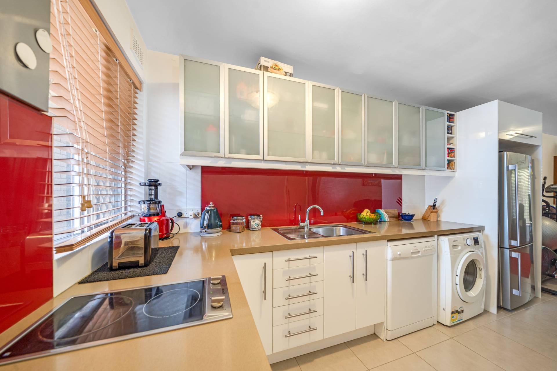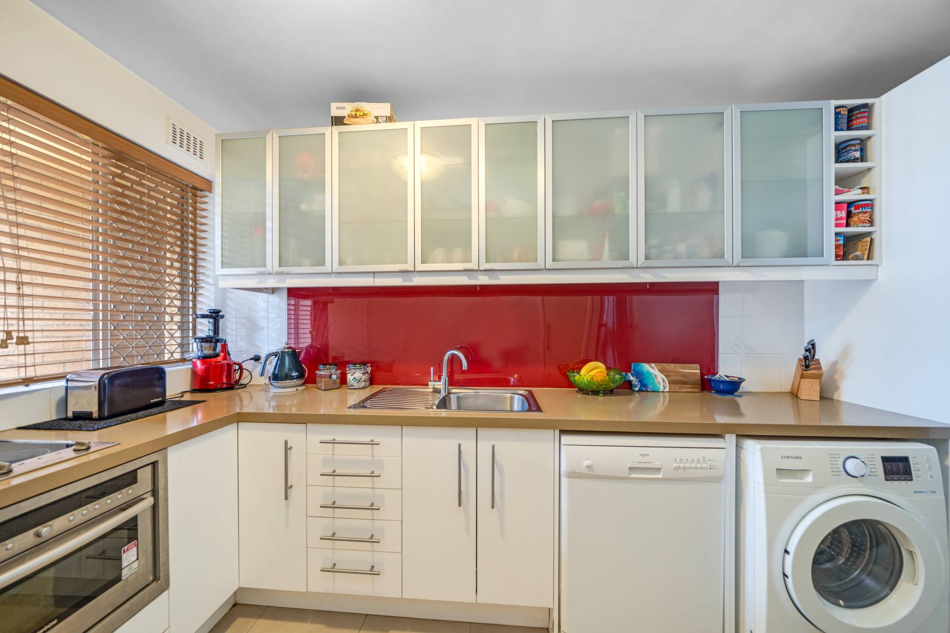 - Modern kitchen featuring s/s appliances and coloured glass splash-back