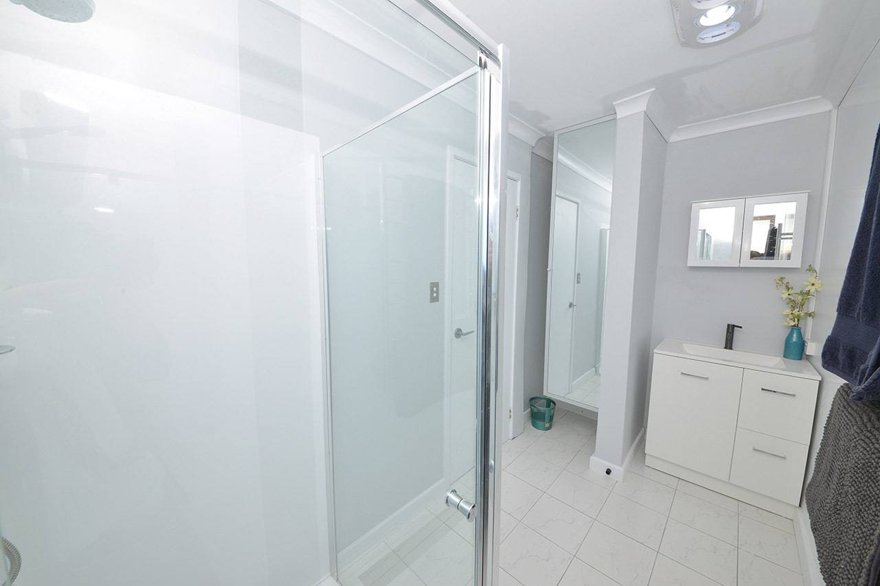 Fully renovated bathroom with walk in shower with glass screen, heat lamp and modern vanity