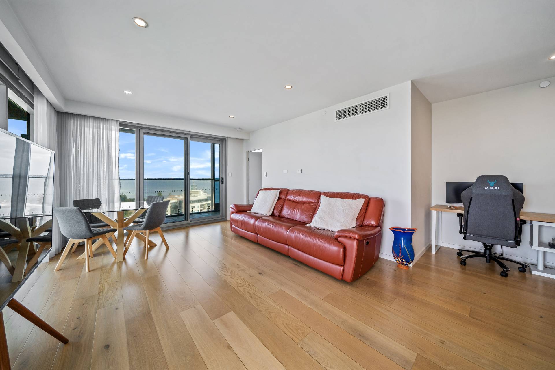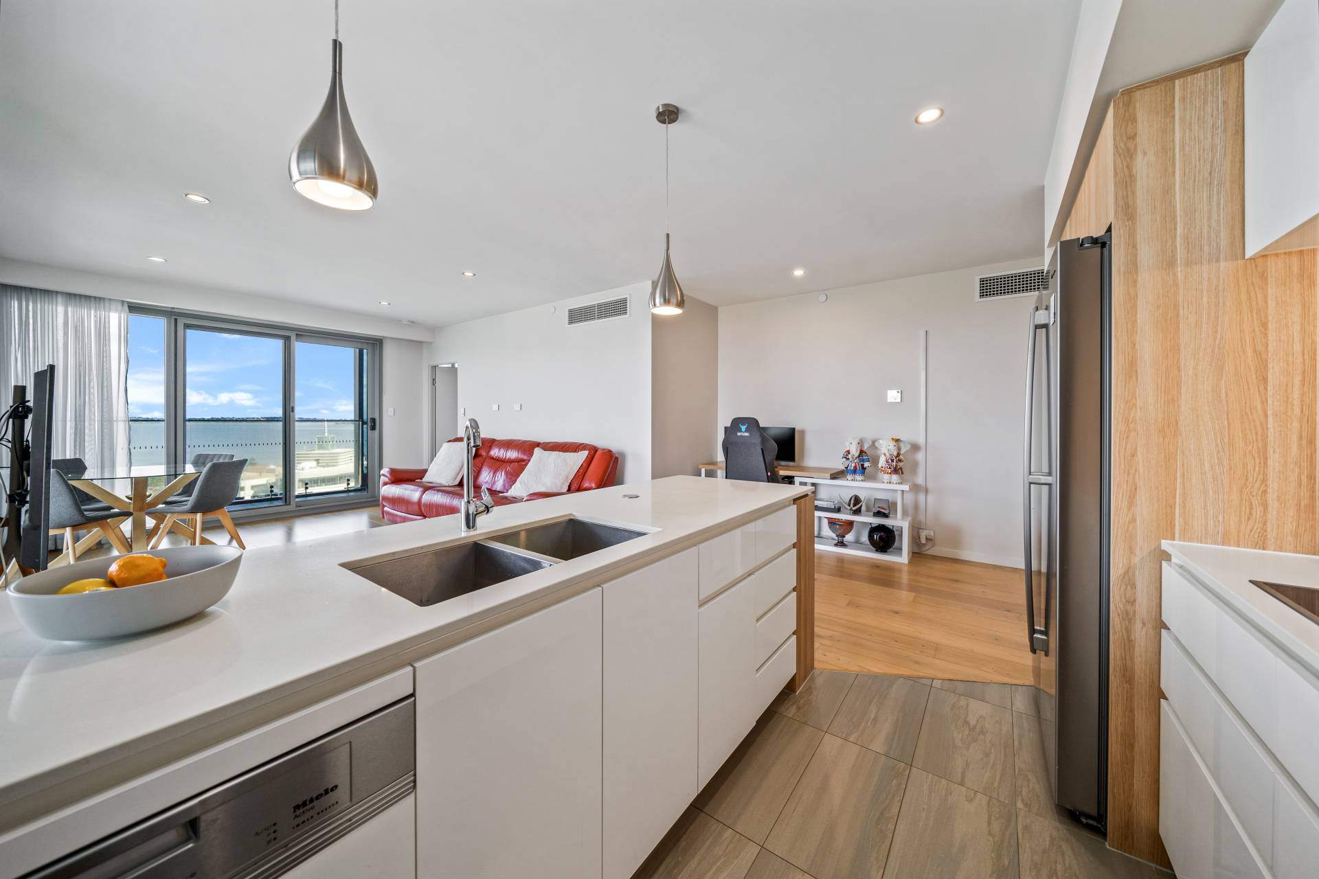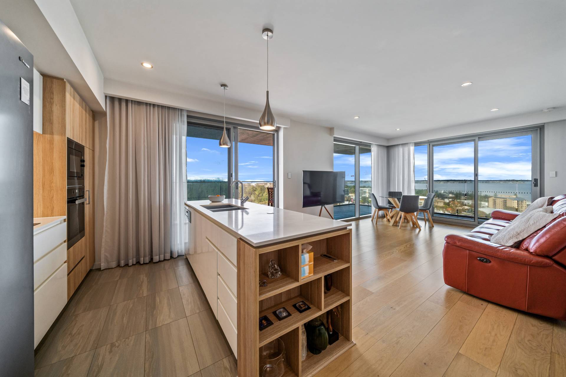 Coastal-inspired timber flooring throughout the open-plan living area and wall-to-wall windows and sliding doors create an airy, light-filled space with room to entertain friends and family.