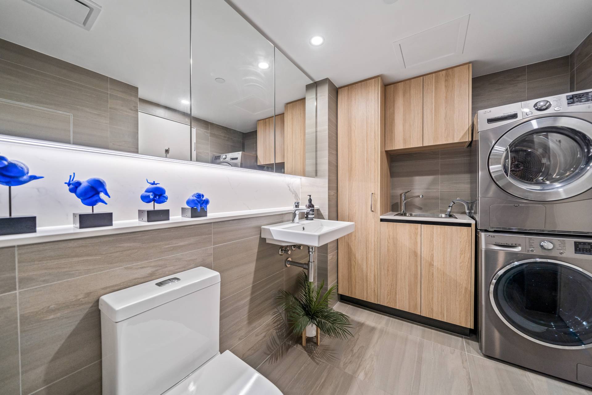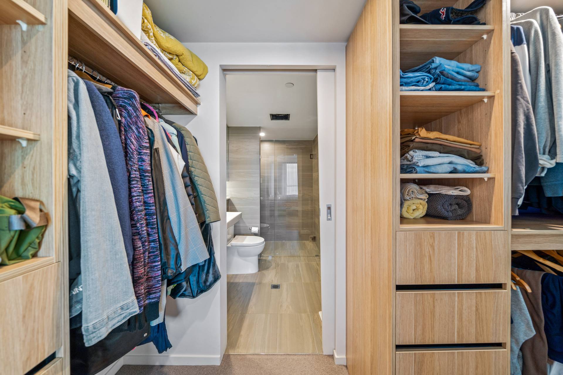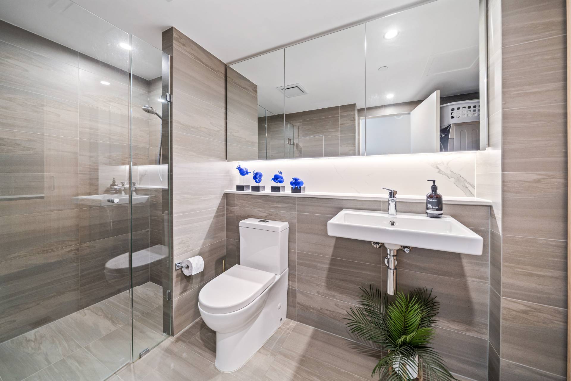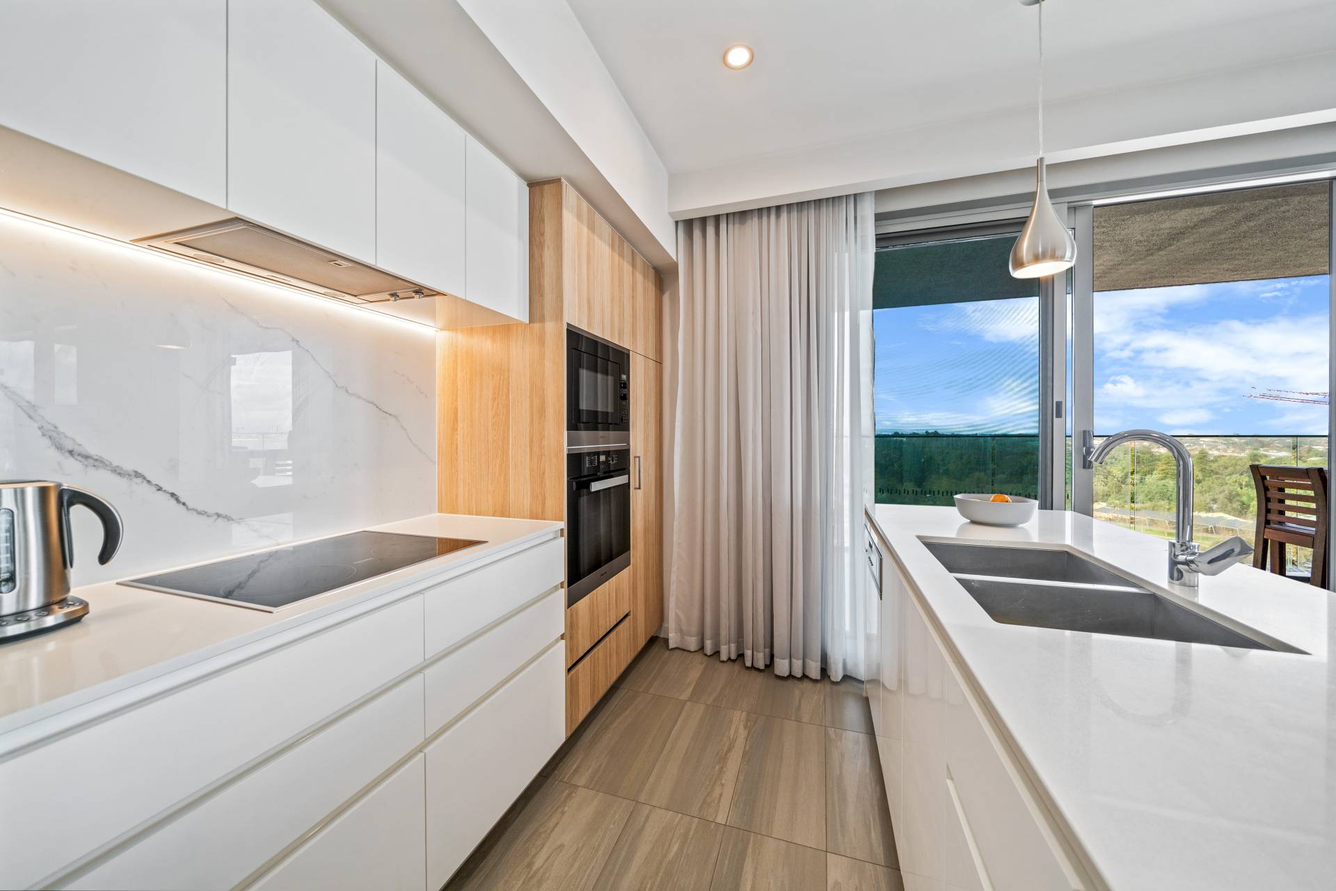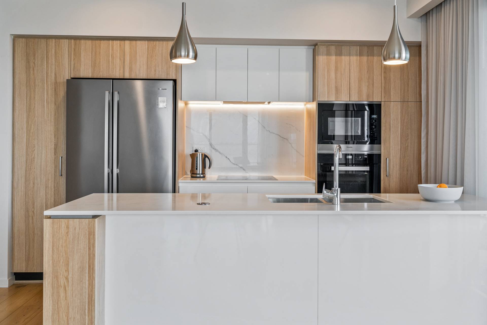 Your sleek, contemporary kitchen includes engineered stone benchtops, soft-closing cabinetry and a double fridge/freezer recess. Top of the range Miele appliances include an integrated dishwasher and microwave, induction cooktop and conventional wall oven. Chic pendant lighting over the benchtops, a marble splashback and a customised walk-in pantry complete this space.