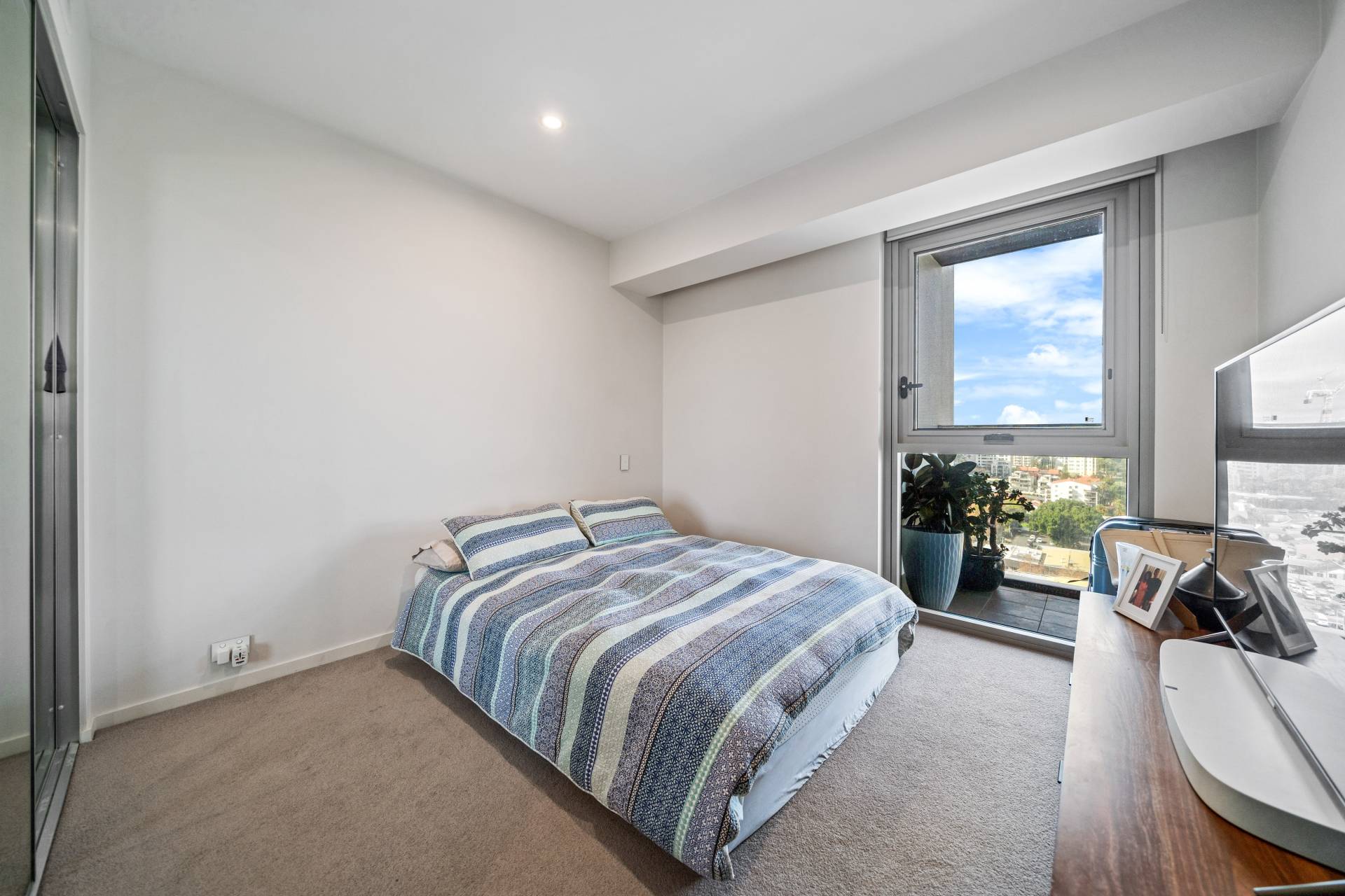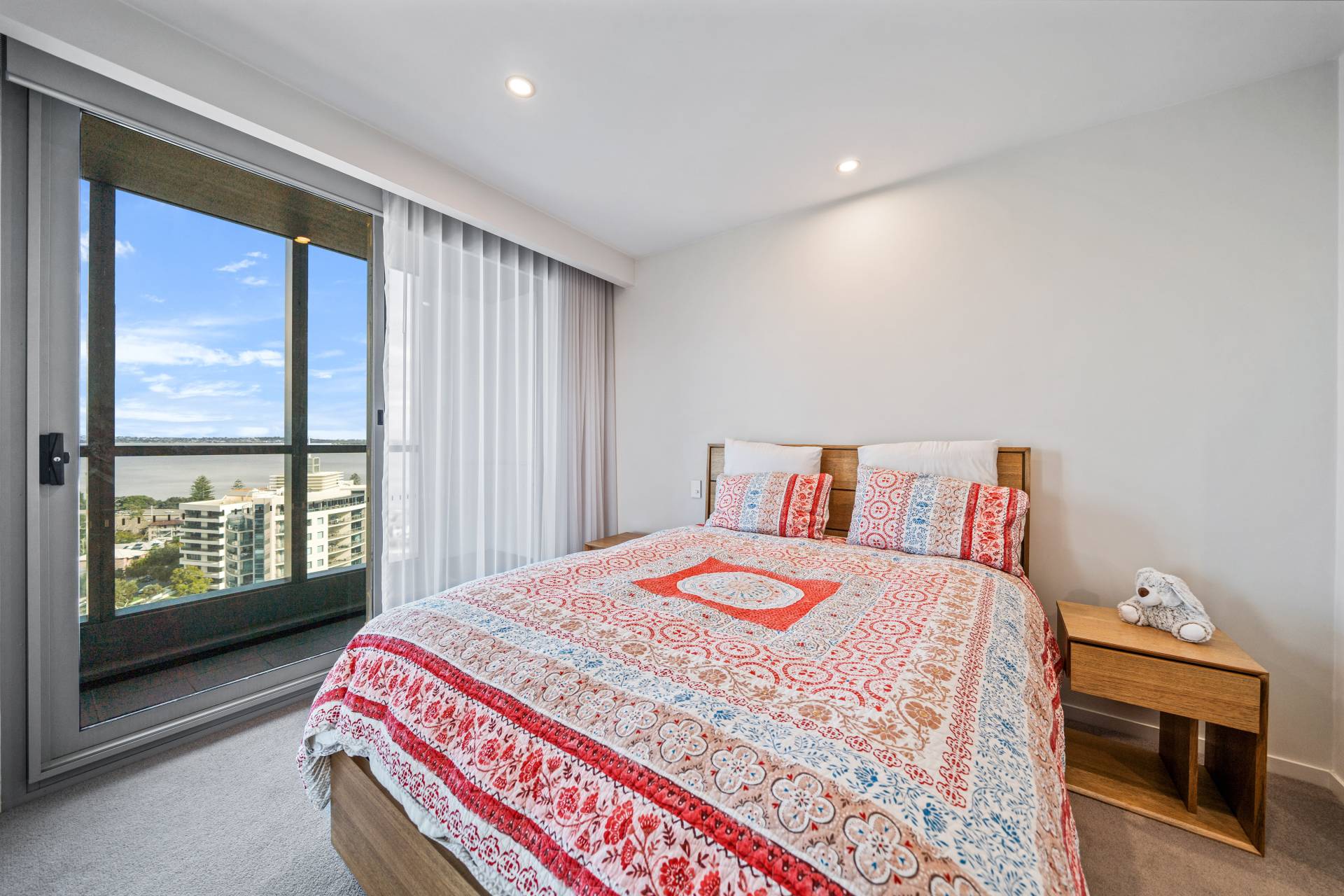 This luxury apartment features a glamour master suite with private balcony access, a roomy walk-in robe and a resort-style ensuite with full-height tiling and a frameless shower. The second bedroom offers double mirrored built-in robes and is serviced by a bathroom of the same deluxe specification.