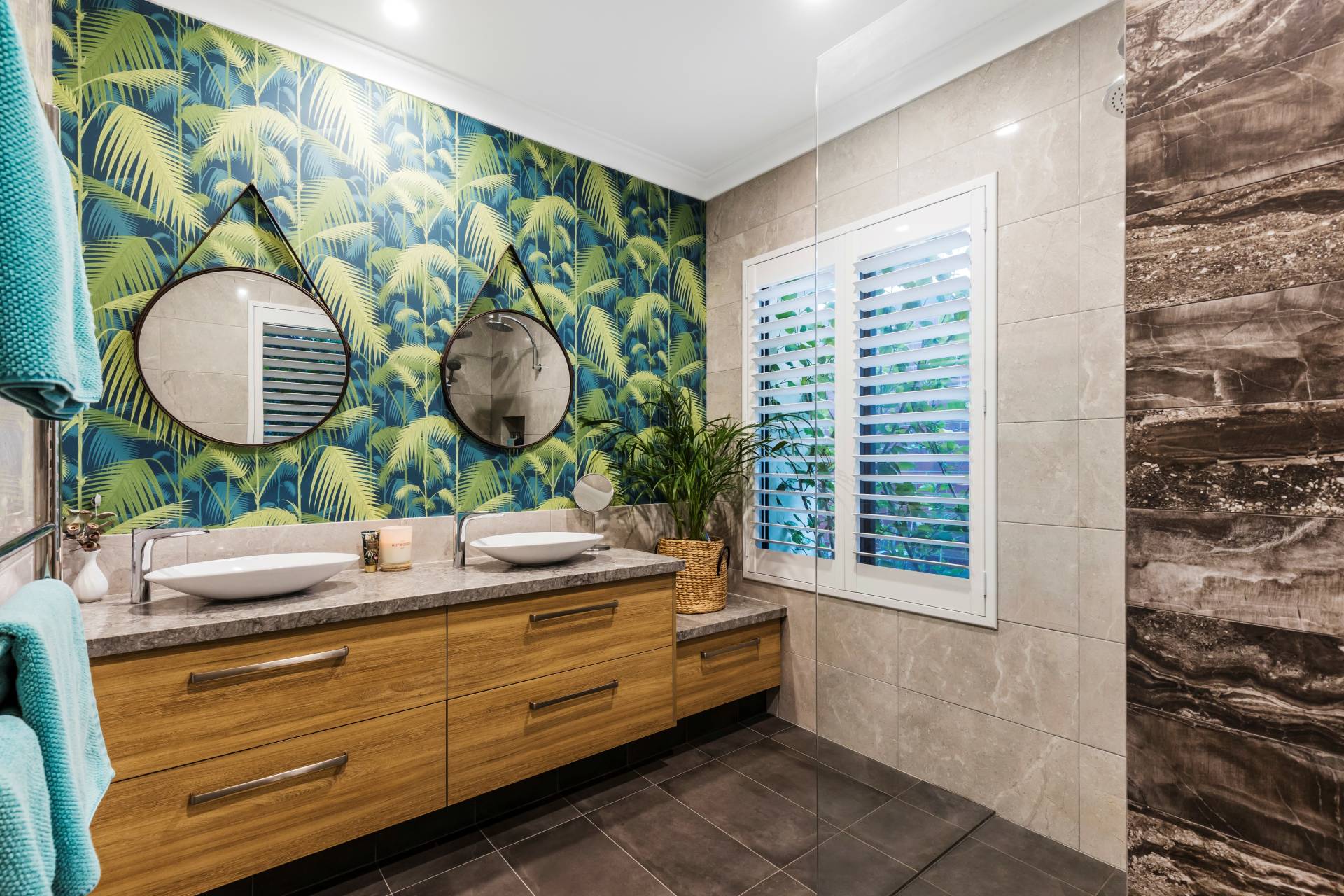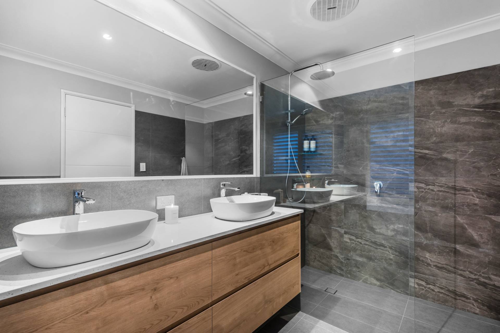 *Freshly renovated fully tiled ensuite bathroom featuring a large double shower with rain shower heads, twin basin vanity with stone top, heated towel rail and separate w/c