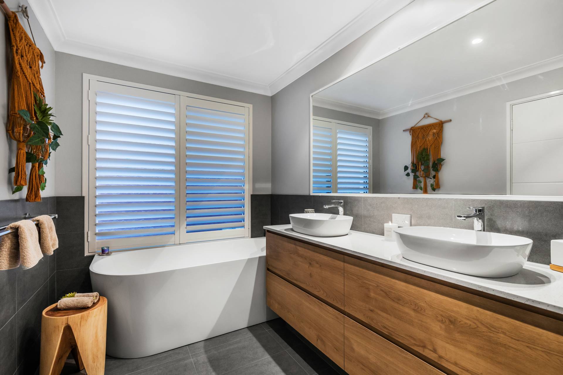 *Freshly renovated main bathroom featuring freestanding bath, large separate glass screened shower with rain shower head, twin basin vanity and separate w/c