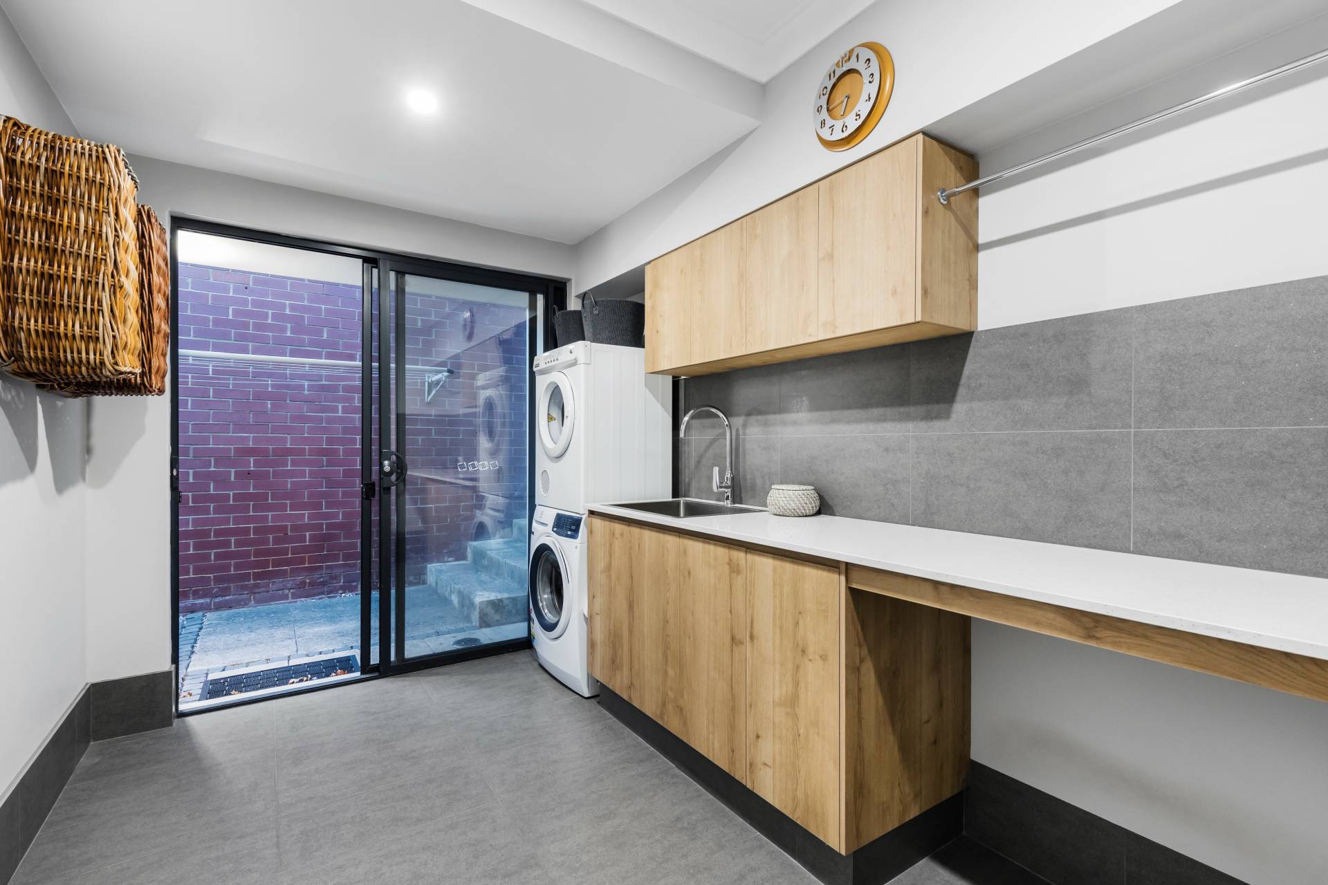 *Freshly renovated extra-large laundry with ample built-in cupboards, clothes hanging rack and sliding external door opening onto the side cloths drying area