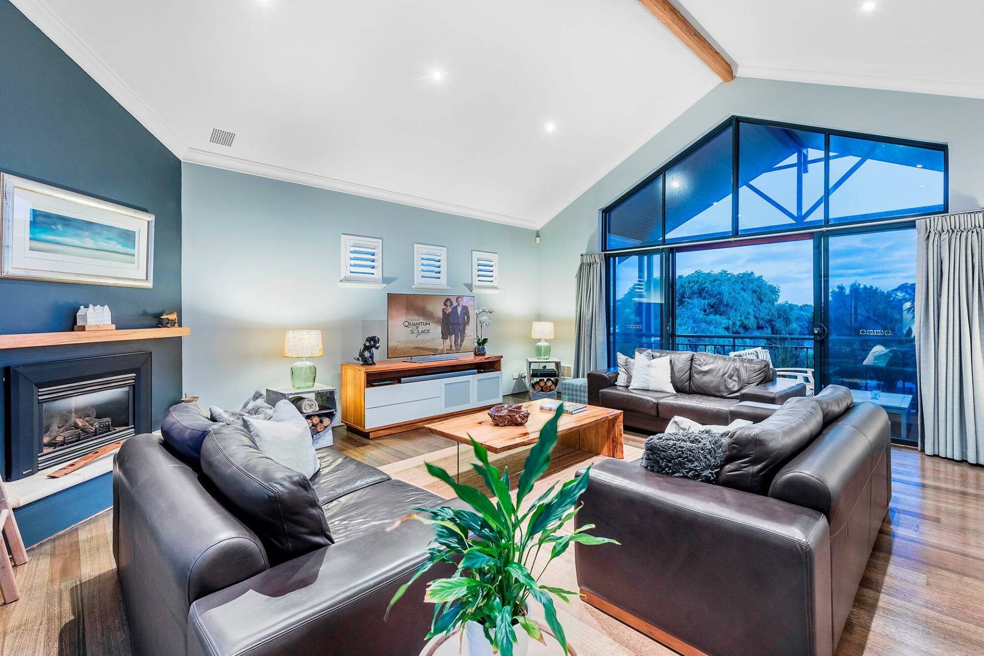Be impressed by the stunning open plan main living areas which boast stylish wooden flooring, high vaulted ceilings, a fabulous chef’s kitchen, gas log fireplace, large entertaining deck and an abundance of natural light streaming in from the numerous windows and doors.
