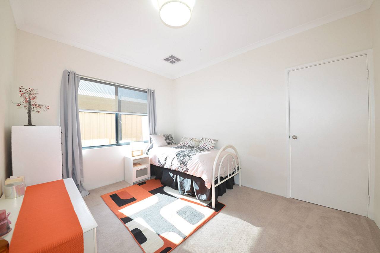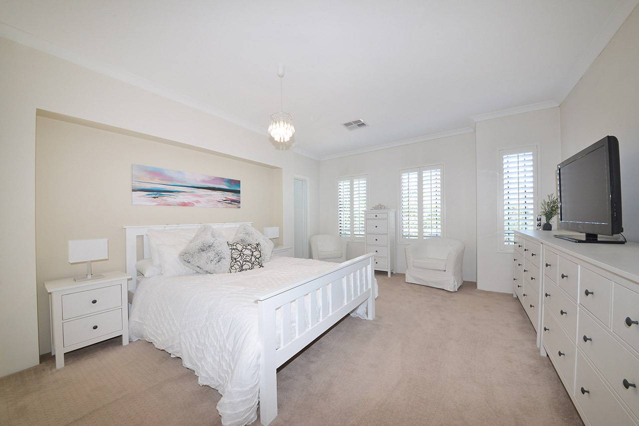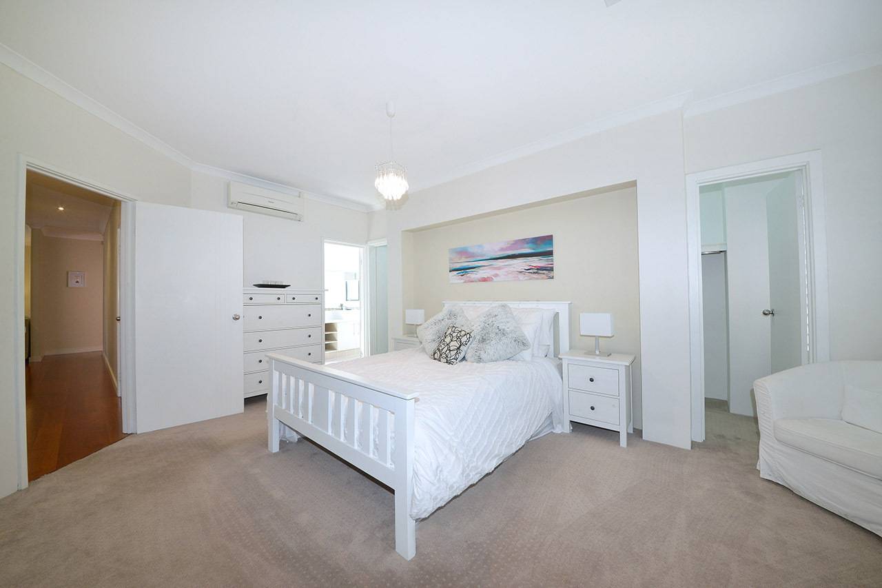 Spacious master bedroom with extra-large walk-through robe, feature lighting, quality plantation blinds to front windows and split system air-conditioning