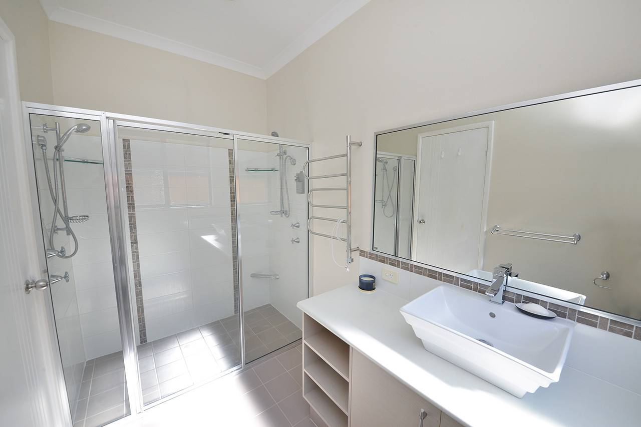 Modern ensuite with extra length twin shower (with glass screen), full length vanity with the finest of fixtures and fittings and with ample room to move