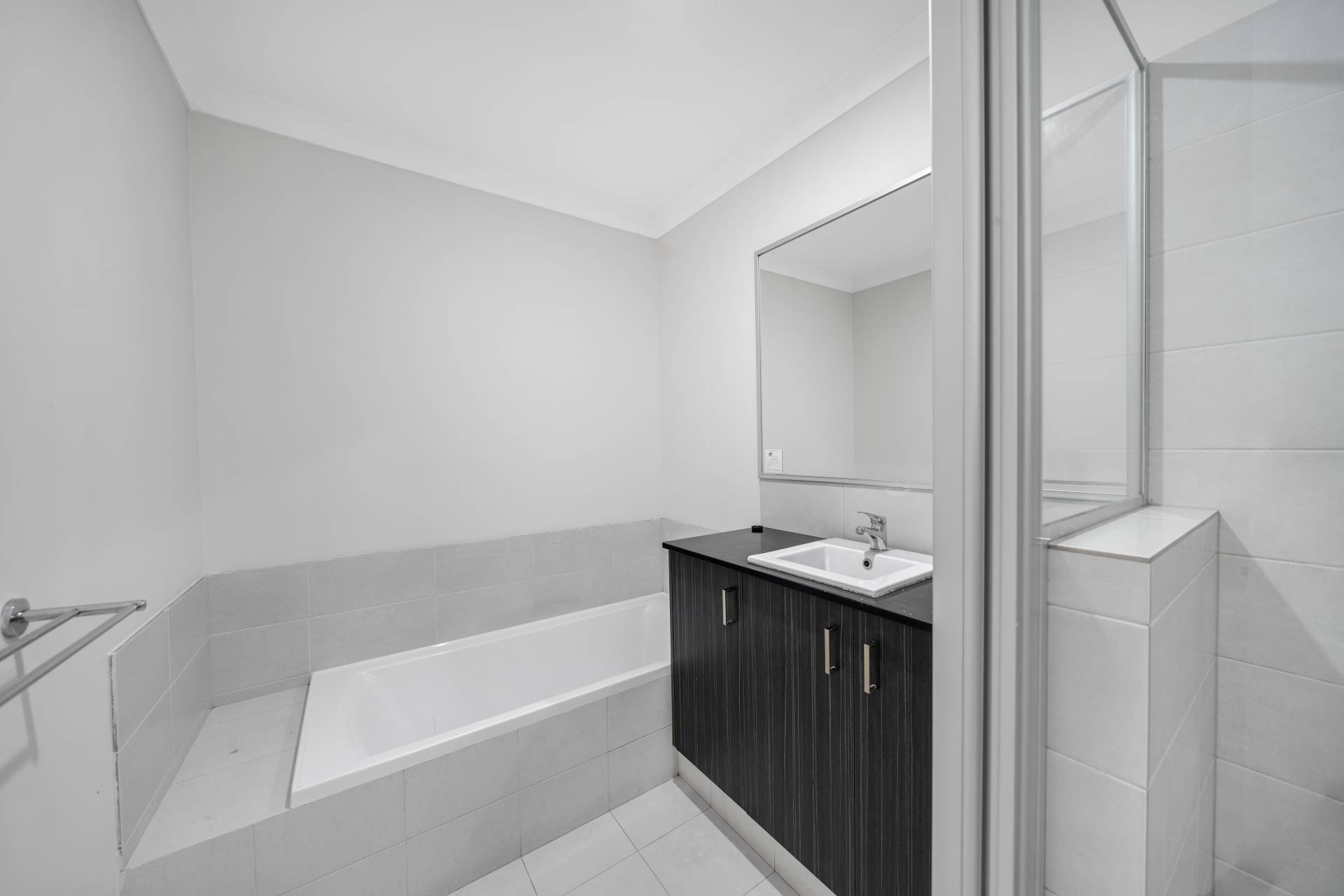 All three bedrooms are carpeted for complete comfort here, inclusive of a larger master suite where a walk-in wardrobe meets a sleek ensuite bathroom with a dark stone vanity, shower, toilet and under-bench storage. A classy main bathroom services the other two bedrooms with its shower, separate bathtub and stone vanity in the middle.