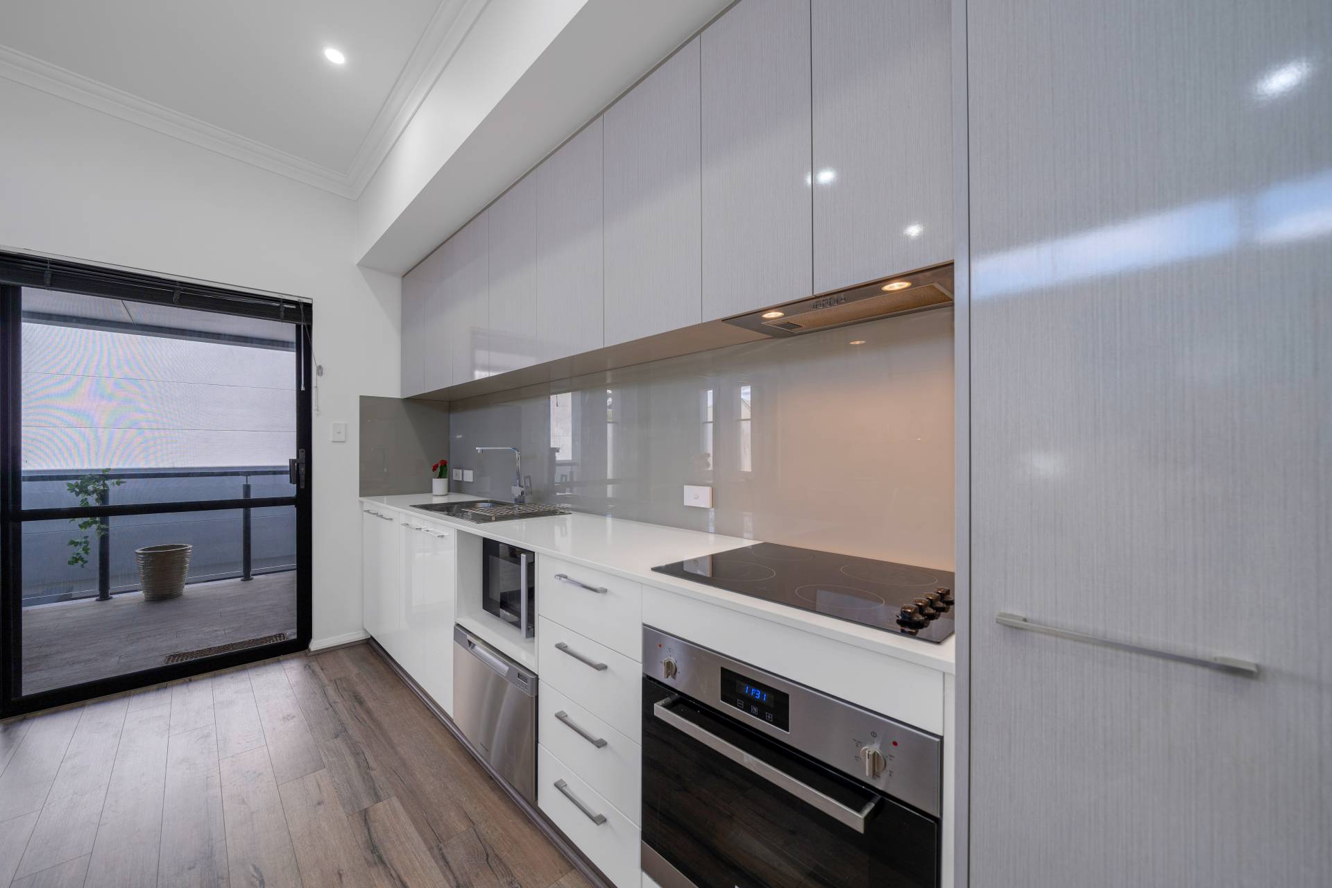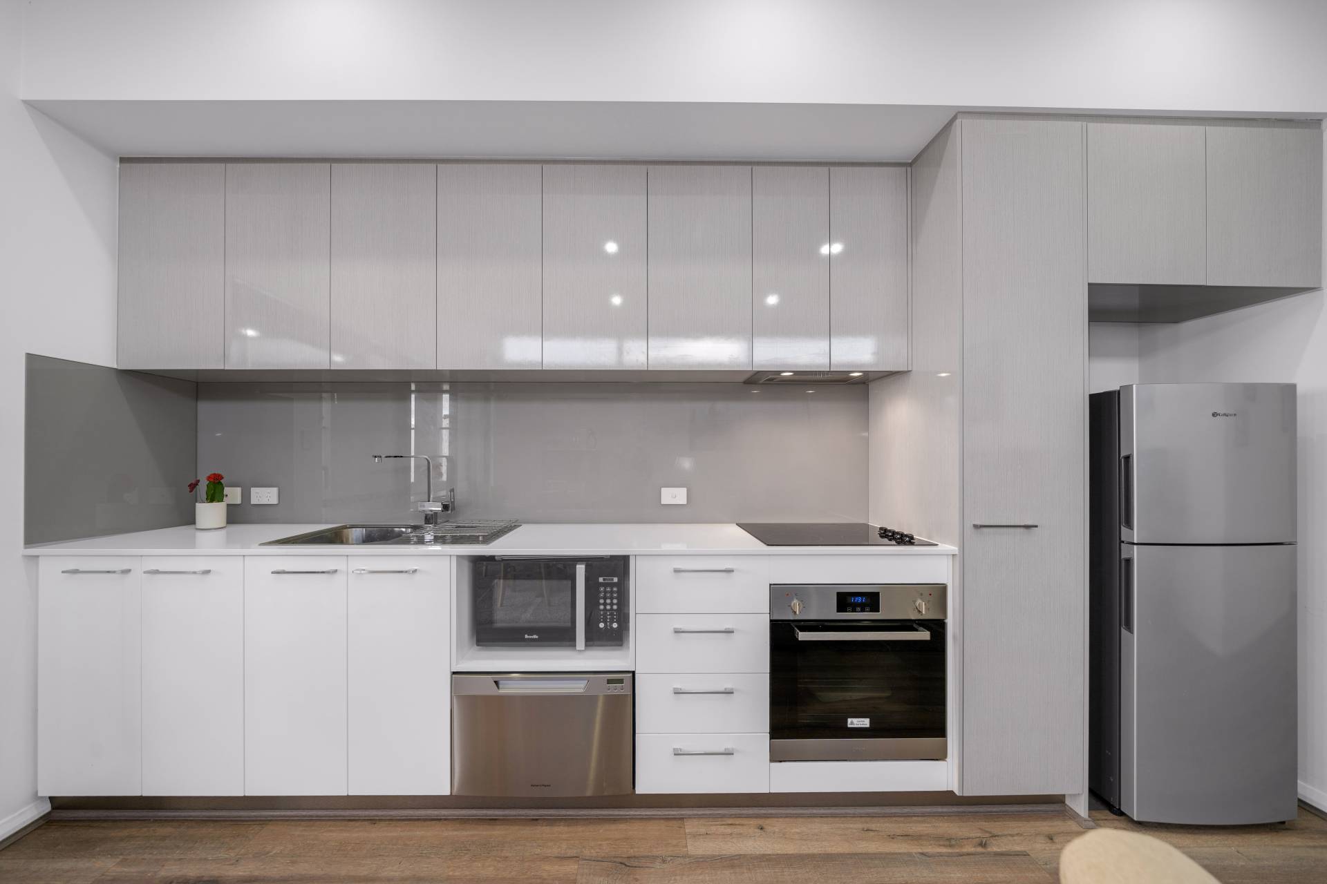 • Modern kitchen with stainless steel appliances including a ½ drawer dishwasher, electric cooktop and a recess for a microwave